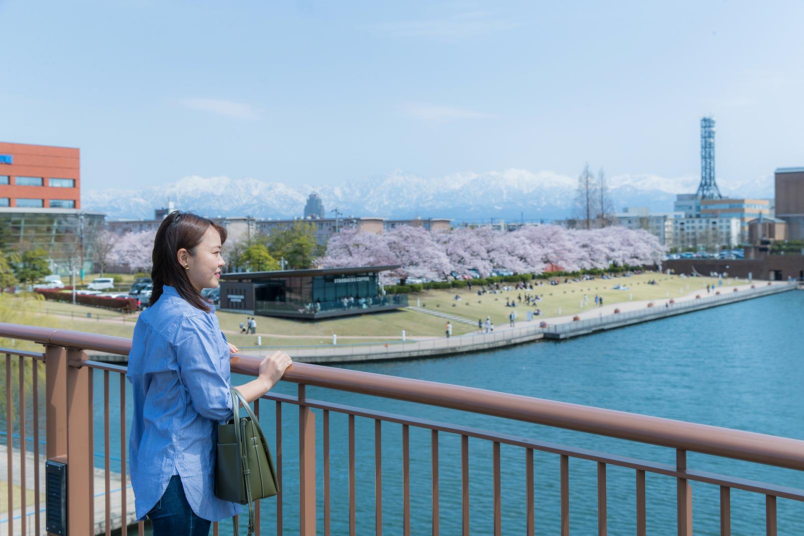 「富岩運河環水公園」は、富山駅北口から歩いて10分の場所にある街中のオアシス。公園の中心に豊富な水を湛える運河が流れ、周囲は緑に囲まれています。折々の自然が美しく、四季の移ろいに癒されようとたくさんの人が訪れます。また水辺で繰り広げられるライトアップも幻想的です。公園の中央にかかる天門橋は、立山連峰の絶好のビュースポットなので記念撮影をお忘れなく!! 出張や旅の朝に、ランニングやウォーキングするのもおすすめですよ。