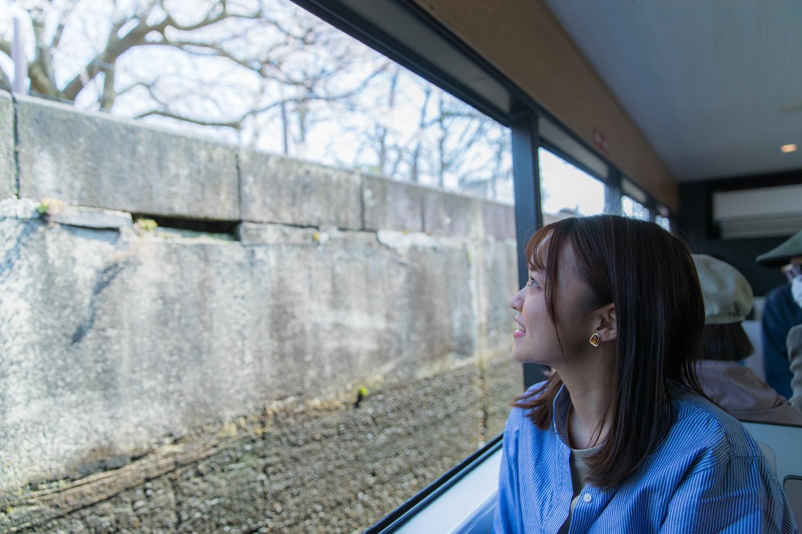 公園内に富岩水上ラインの船着場があります。中島閘門までの往復利用もできますが、今回は北前船交易で栄えた岩瀬行きのコースをチョイス。岩瀬浜駅から富山駅へ戻るLRTの切符がセットになった人気のコースです。船が出発すると、運河の歴史や水辺でくつろぐ渡り鳥のことなどを紹介するガイドさんのトークがスタート。ステンドグラスがきれいな木場橋をくぐると、川沿いの遊歩道を散歩している人が手を振ってくれ、富山の人の温かさに胸がいっぱいになります。