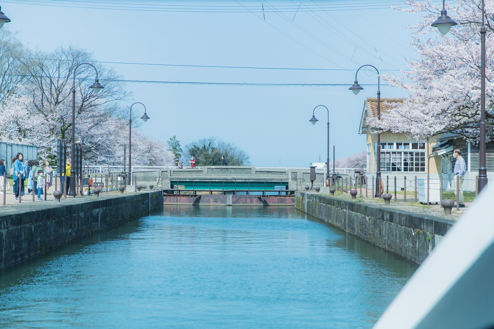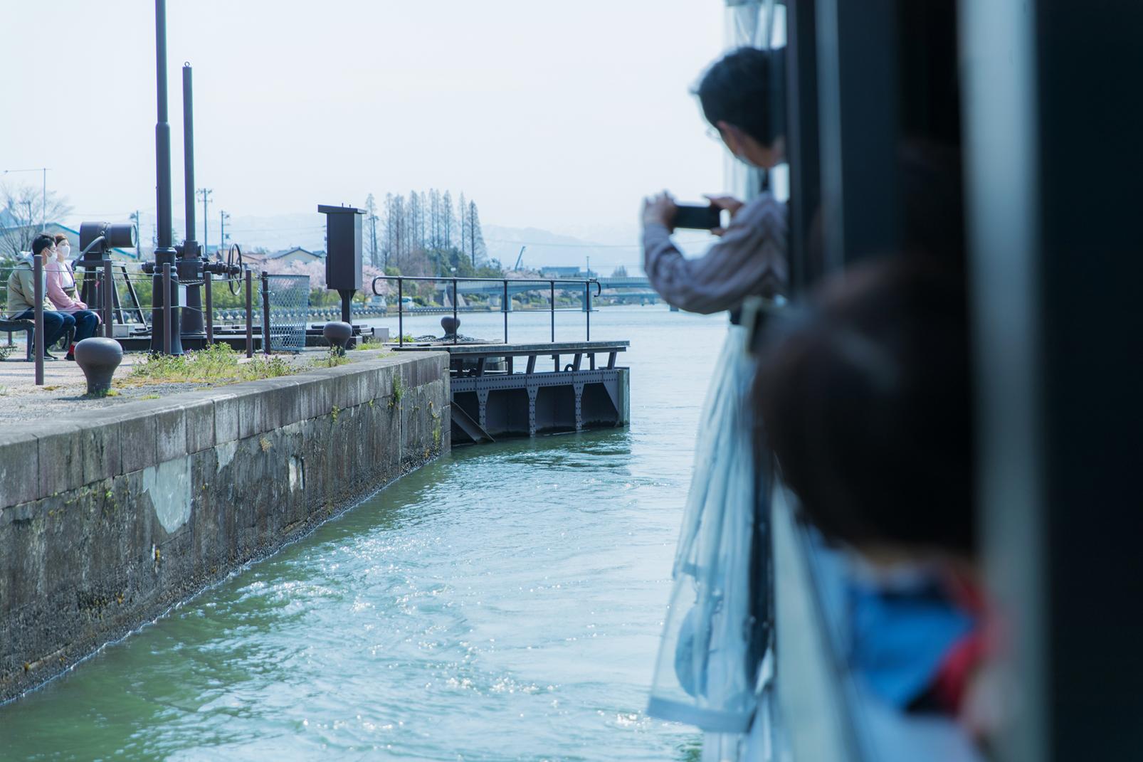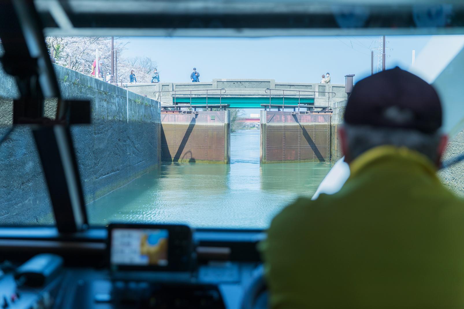 中島閘門が見えてきました。社会の教科書でも習った「パナマ運河」方式の閘門で、扉の前(閘船室)に船が到着すると、後方(富岩運河環水公園側)の扉がピタリと閉まります。鉄の扉は水を通さないようにリベットでしっかりと固定された強固な造り。気がつくと、水面だった場所から水が引いて船が少しずつ下がっているのが分かります。2.5m水位が下がったところで目の前(岩瀬方面)の扉が開き、再び船が進み始めました。