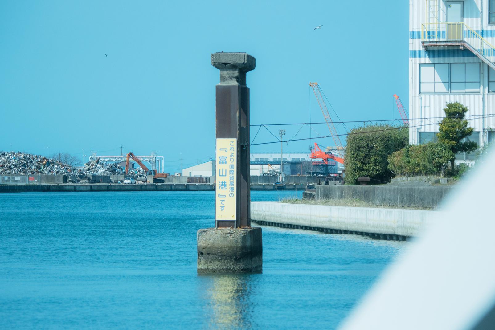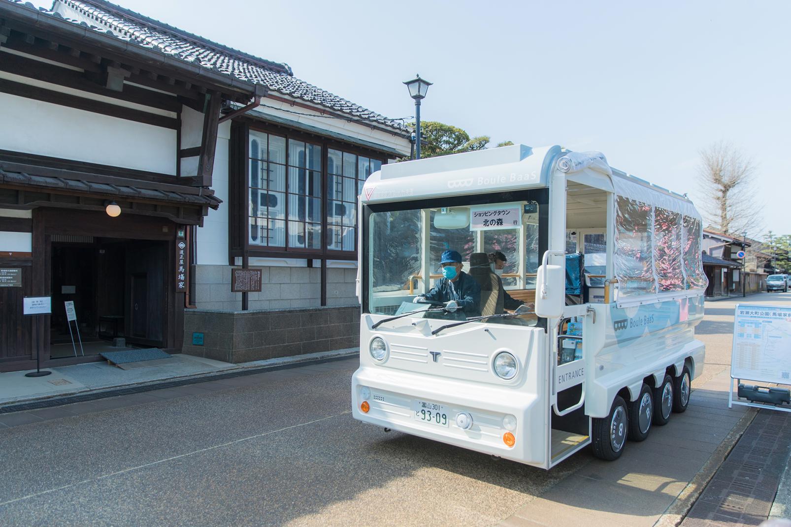 運河の真ん中に石柱が立っていると思ったら、ここから富山港という目印でした。富山港は貿易港なので、海が近づくにつれて大きな船を何隻も見かけます。運河を進んでいたときよりも、肌に受ける風が心なしか強くなってきました。右手側に見える富山港展望台のそばが、今回の目的地である東岩瀬町周辺です。下船すると岩瀬カナル会館の駐車場で試験運行中のグリーンスローモビリティ「Boule Baas」を発見。旧北国街道まで乗せてもらうことにしました。