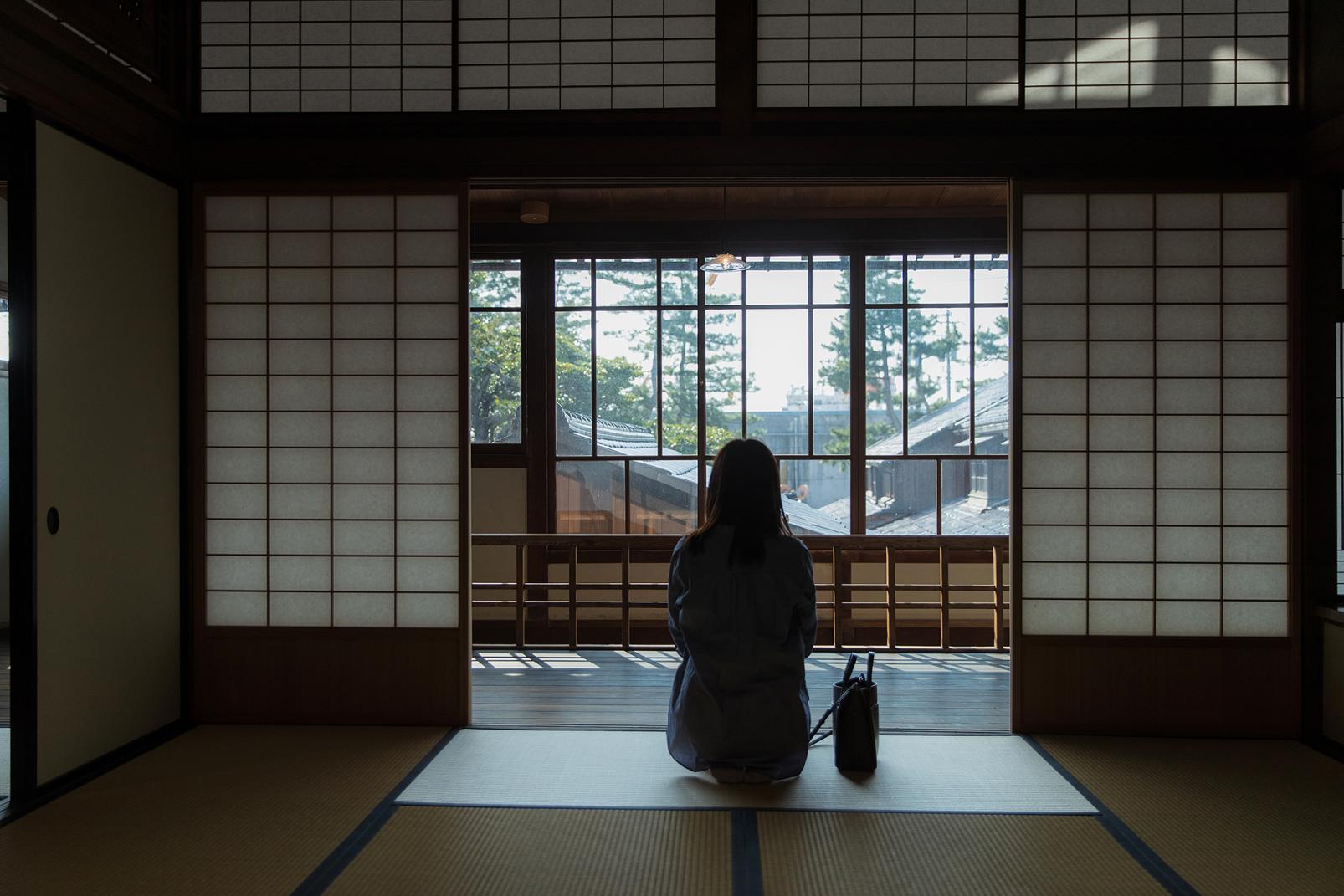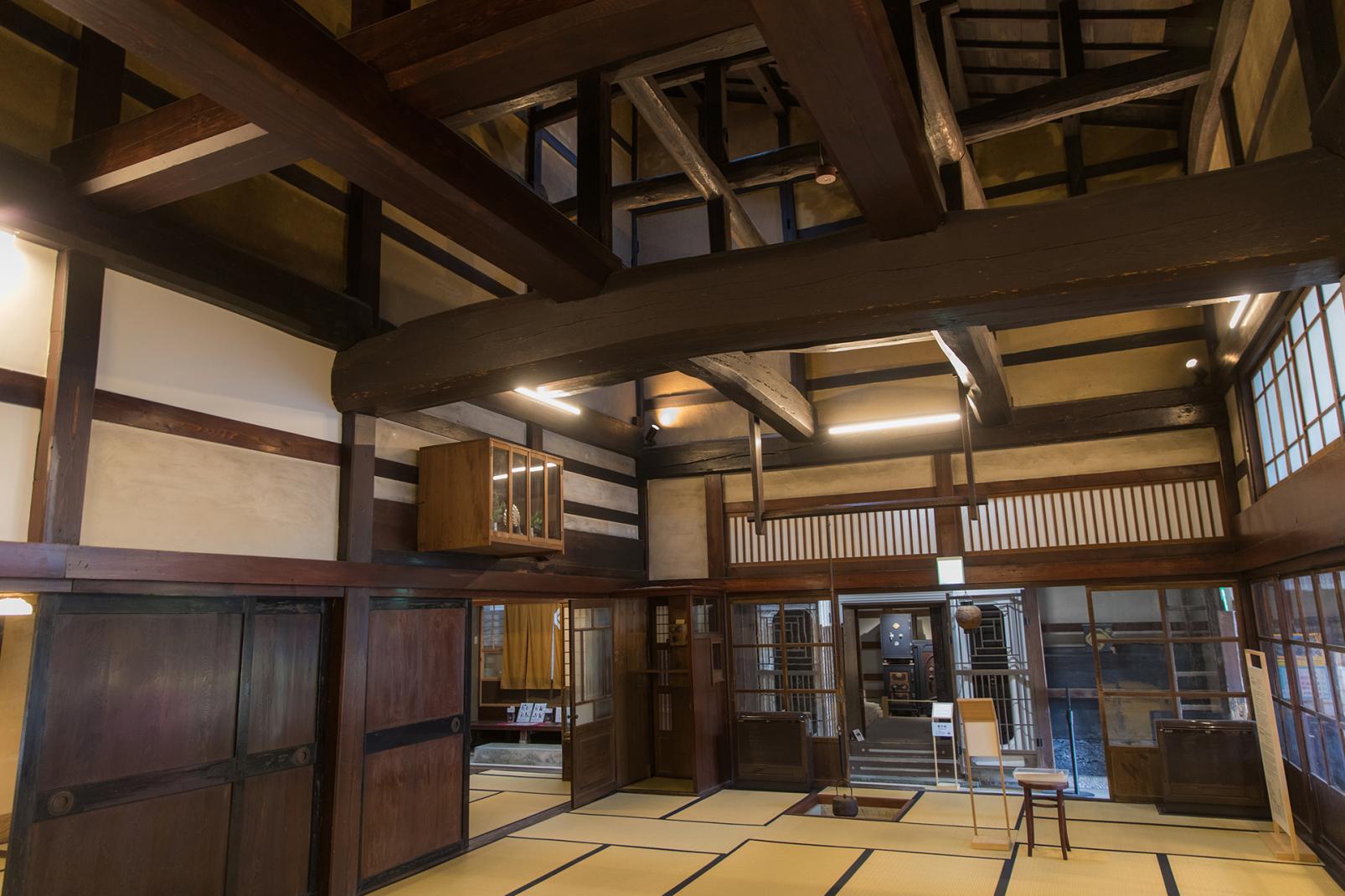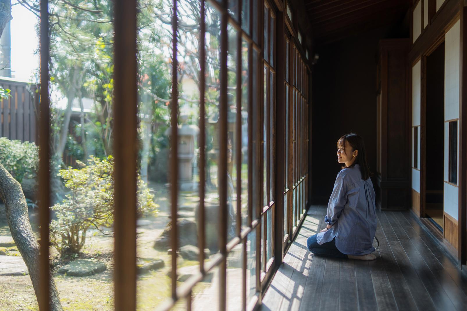 岩瀬は北前船交易で栄えた町。もっとも財を成したといわれる廻船問屋の「道正屋 馬場家」に着きました。足を踏み入れると「トオリニワ」という屋内通路の長さに驚きます。向こう側の端までが長さ30mもあり、入り口は旧北国街道、裏門はかつての港湾に面しています。33畳もある広間は力強い梁が組まれていて、台所や水回りの造りもレトロ。ゆらいだガラスの向こうの緑は、キラキラとしてずっと眺めていたいほどです。
