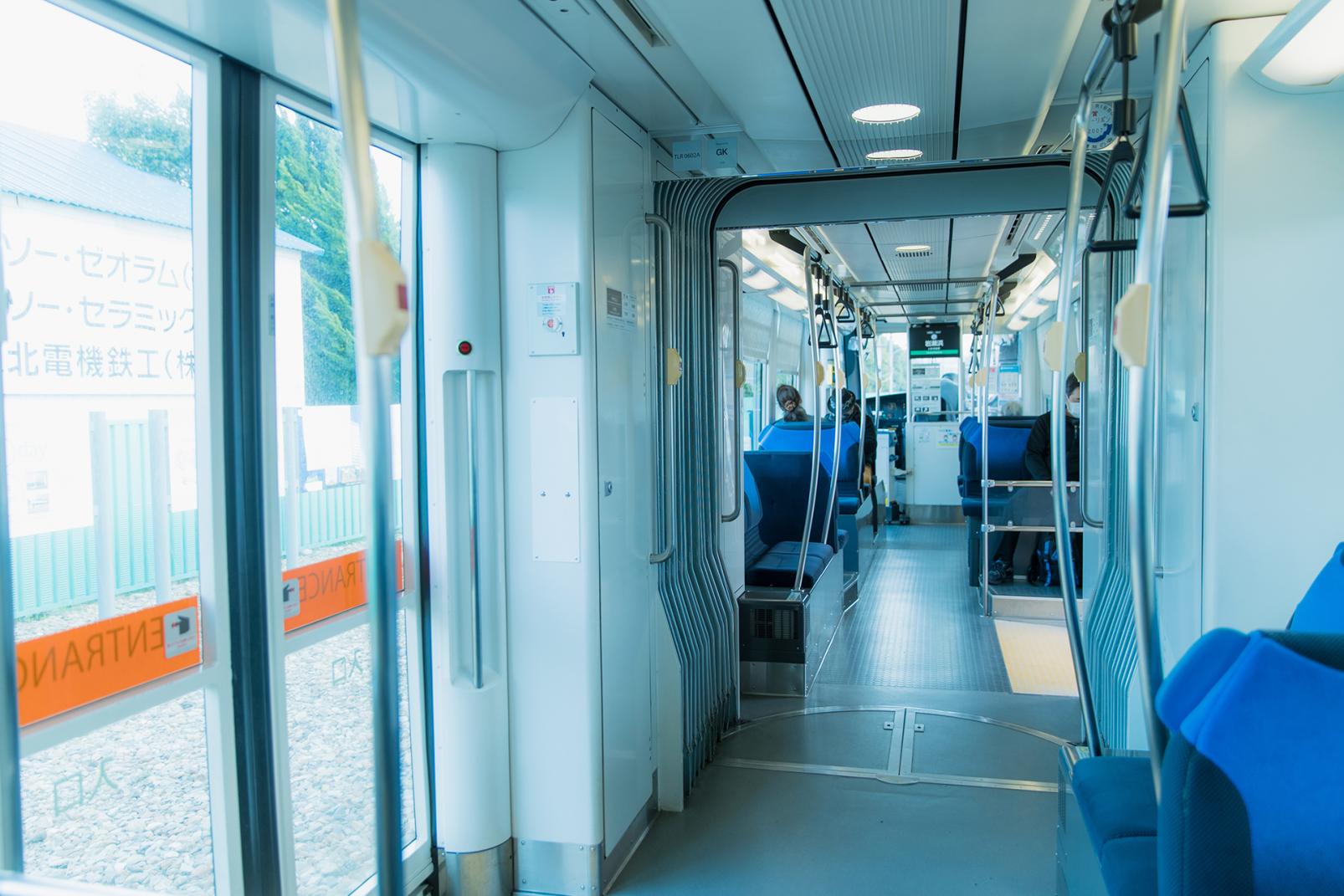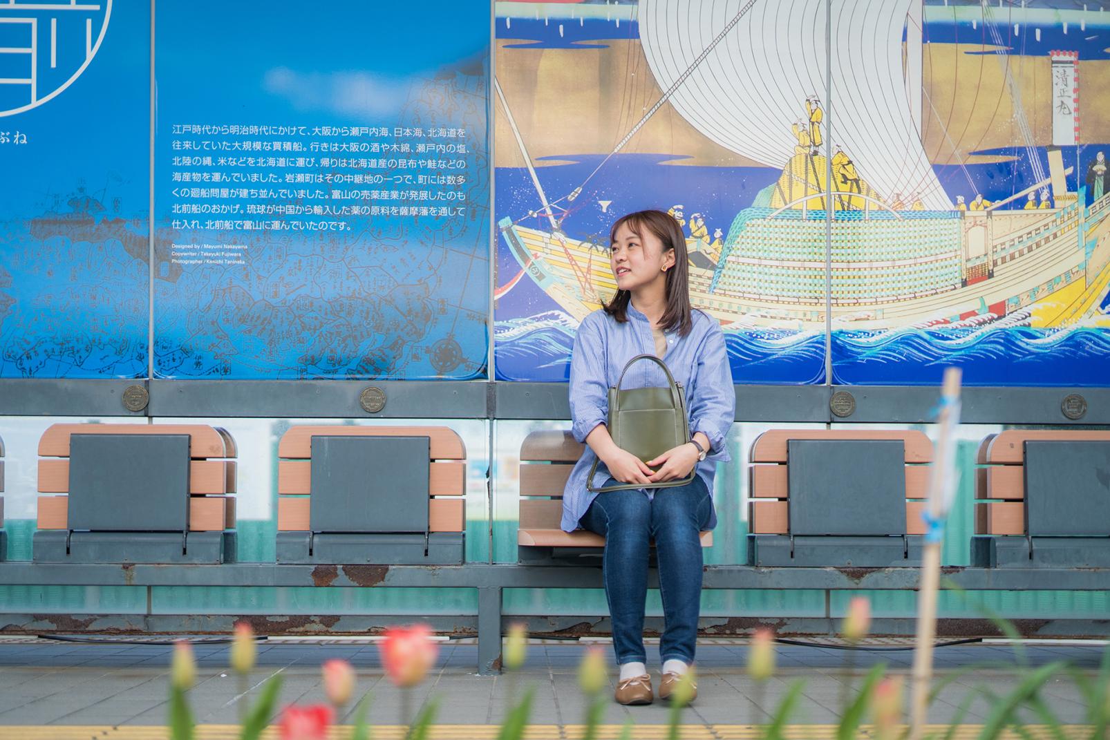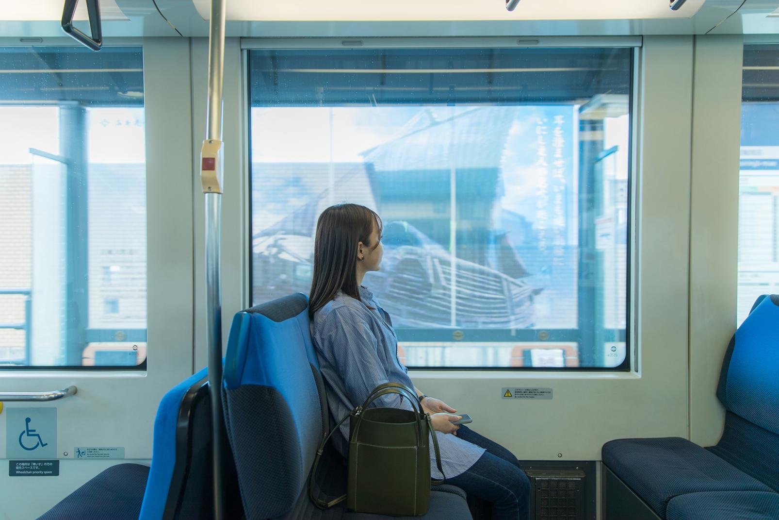 港町の岩瀬浜駅から富山駅までの路線は、電車と沿線の住宅やお店との距離が近く、地元の人の暮らしぶりが伝わる風景が目に飛び込んできます。ホームに地元の小学生が考えたクイズや学習内容が掲示された駅もあって、なんだか微笑ましい気分になります。電車内には学校帰りの中高生や高齢の人も多く乗車していて、路面電車が地元の人にとって大切な交通手段であることが伝わってきます。LRT車両は、揺れが少なくて乗り心地が抜群ですよ。