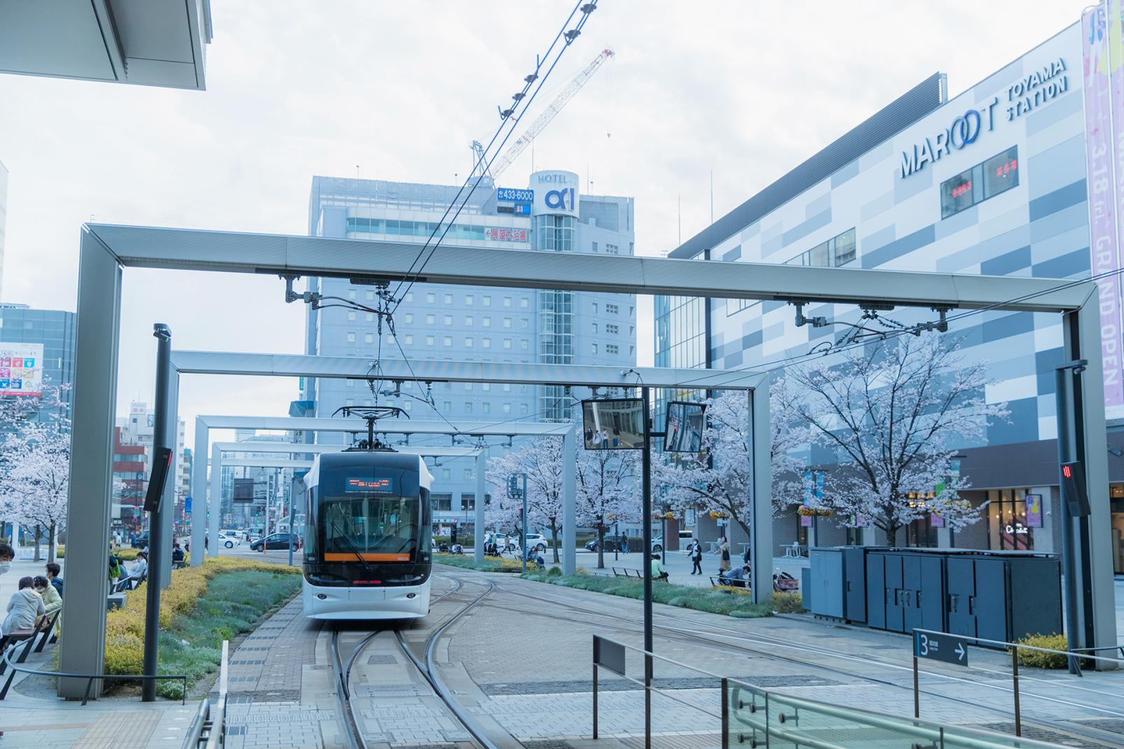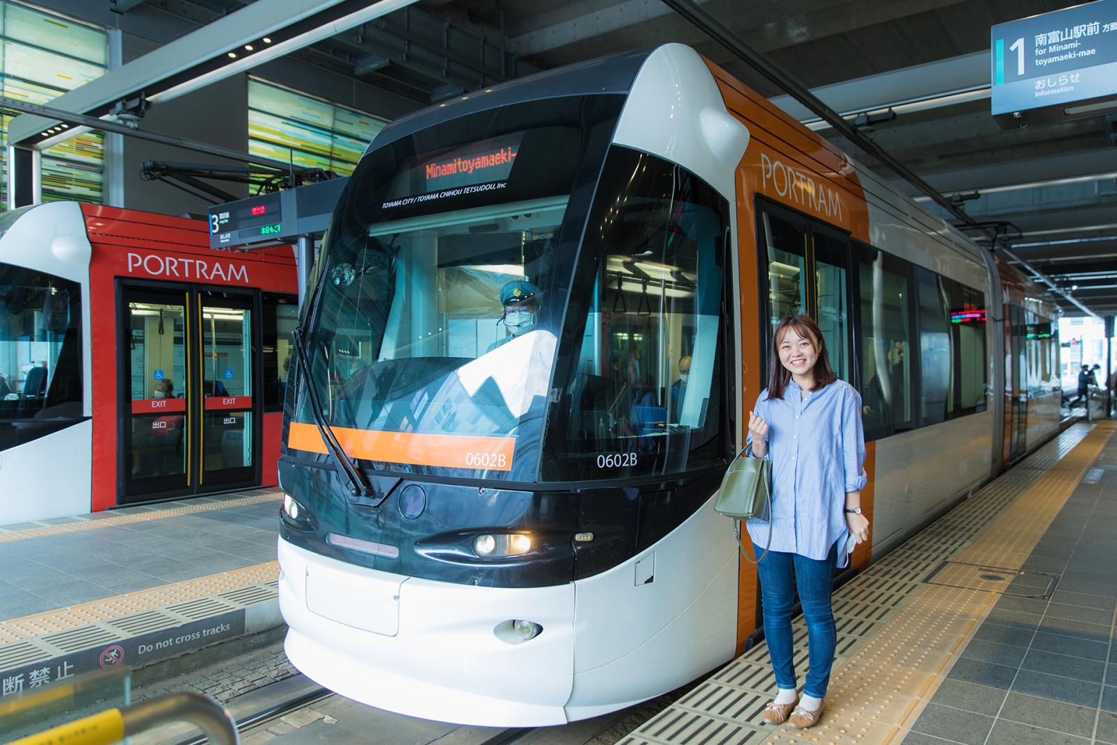 富山駅に到着し、7.6㎞、約25分の路面電車の旅が終了を迎えます。今回の車両以外にも車体のラインカラーは全8色あり、ほかにもセントラムやサントラムもこの路線を運行しているそう。富山駅には富山地鉄の路面電車専用ホームがありって、富山駅前方面に向かうと2022年3月にオープンしたばかりの商業施設「MAROOT」もあります。富岩水上ラインと路面電車を利用して、岩瀬へ小旅行してみませんか? たくさんの楽しい瞬間に出会えます。