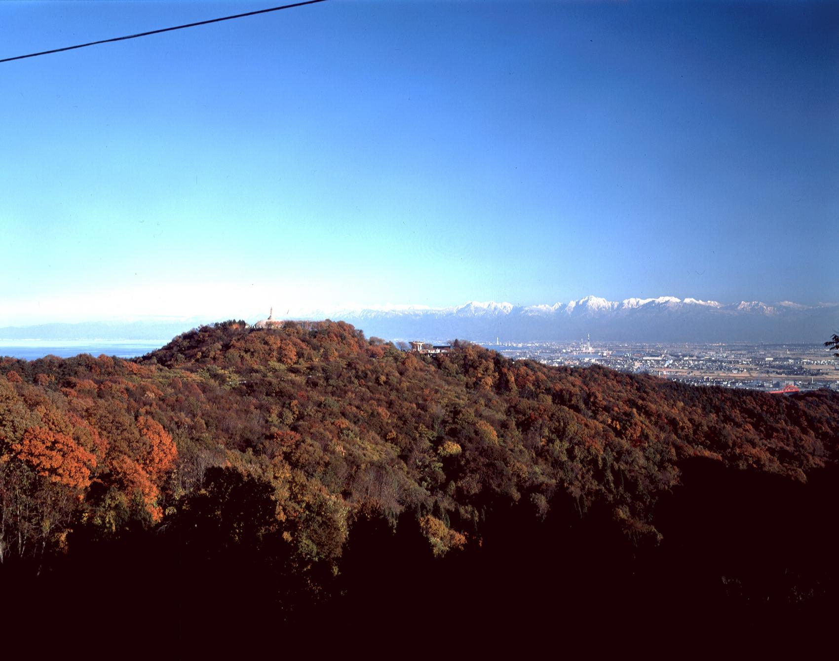 8.4㎞のドライブウェイ「二上山万葉ライン」。見渡せば3,000m級の立山連峰と広大な砺波平野が一望できる絶景地です。頂上付近より降りてくる紅葉はコントラストも素晴らしいです。 -