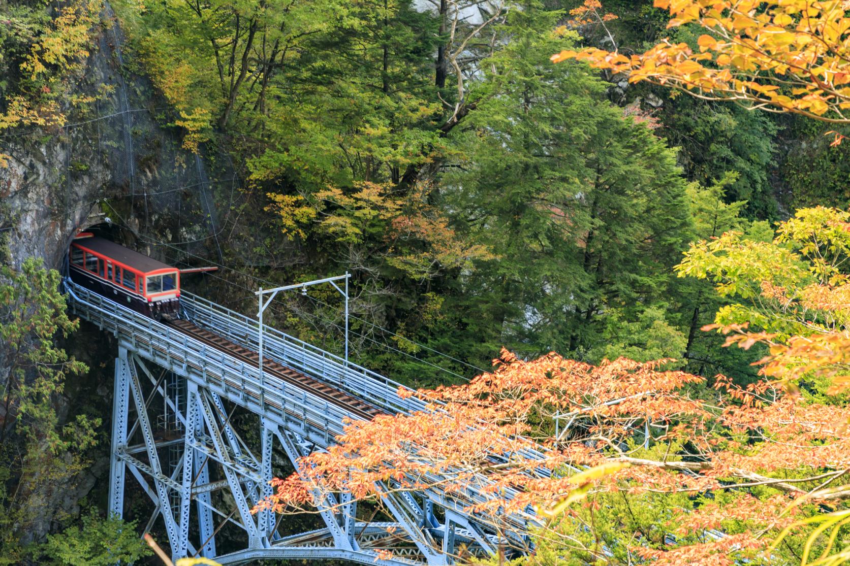 断崖絶壁の黒部峡谷。駅の両側に勾配があって狭く、電車がすれ違うスペースが確保できなかったため、「スイッチバック」という方法で、上りと下りの列車交換を行っています。本線から引き込み線に入って一度停車。発車する際に一旦バックして本線に入り、出発します。国内では数少ないスイッチバックは鉄道ファンのみならずとも必見です!
