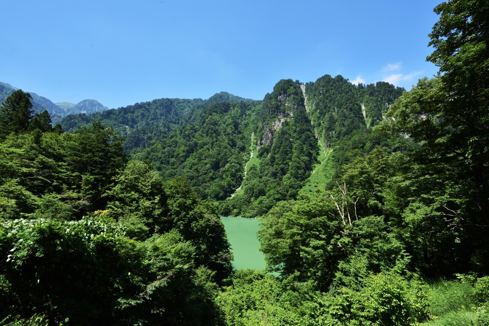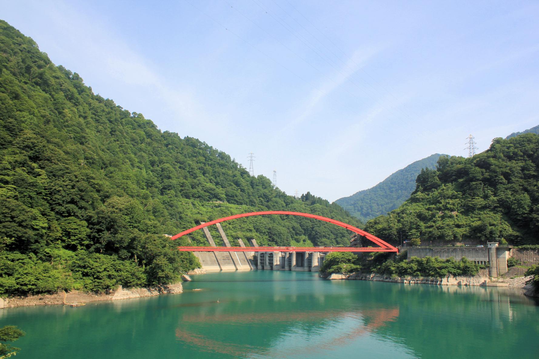宇奈月ダム完成によって生まれた人工湖。エメラルドグリーンの湖面と黒部峡谷の大自然は写真に収めたくなる美しさ。湖にはサルが対岸に渡れるように作られた吊り橋(サル橋)があり、運が良ければ渡る様子が見られるかも!