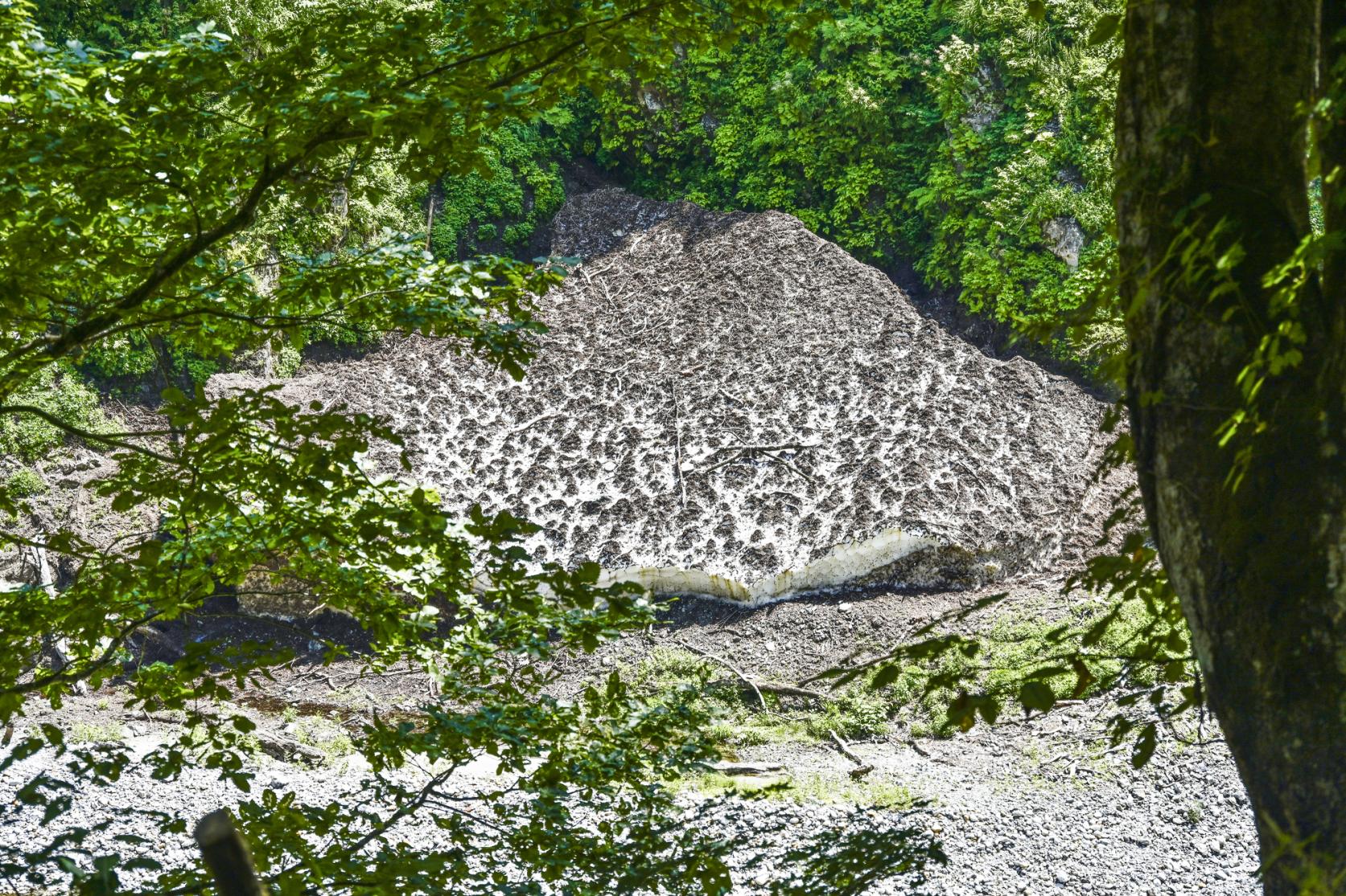 百貫山に降った雪が雪崩によって谷に積み上がり、雪の塊となったものがすべて解ける前に冬を迎えることもあるため、「万年雪」となります。対岸の展望台から雪渓を間近で見られます。5月頃から初夏がおすすめ。鐘釣駅から徒歩約3分。