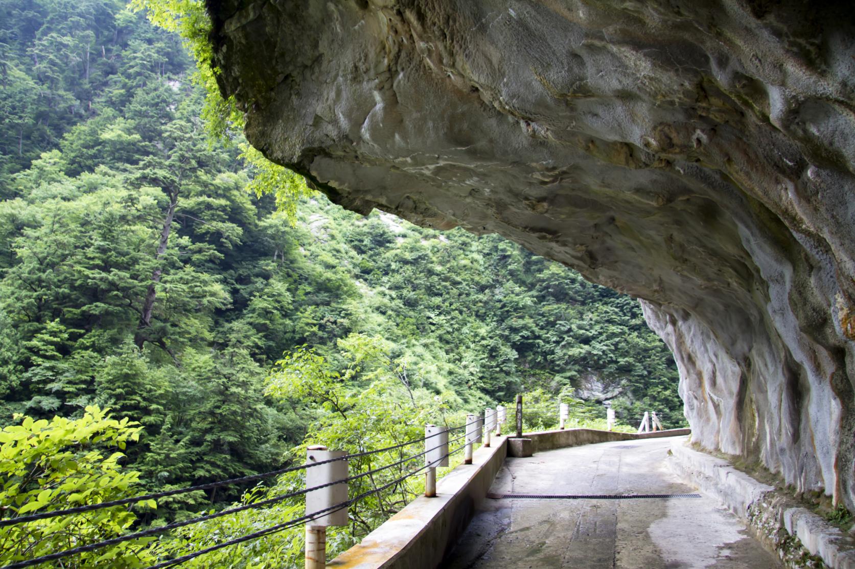 欅平駅から奥鐘橋を渡ると見えてくる、岩壁をえぐり取って造られた歩道。頭上に迫る岩肌は歩く人を飲み込むようかのに見えて迫力満点!人気のフォトスポットです。