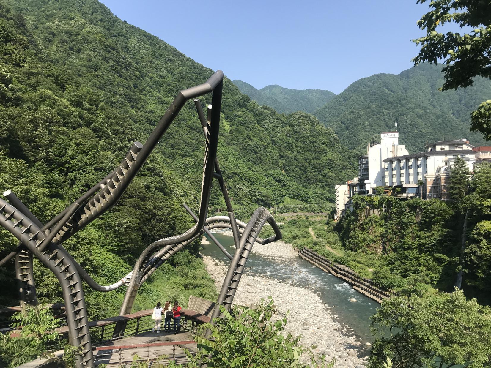 もっと見る温泉街にある謎の巨大オブジェはなんと展望台!スペインの著名建築家エリック・ミラーレスが設計したもので、大空に飛び立つ鳥の姿をイメージしているそう。黒部川や周囲の山並みを一望でき、記念撮影にも最適。