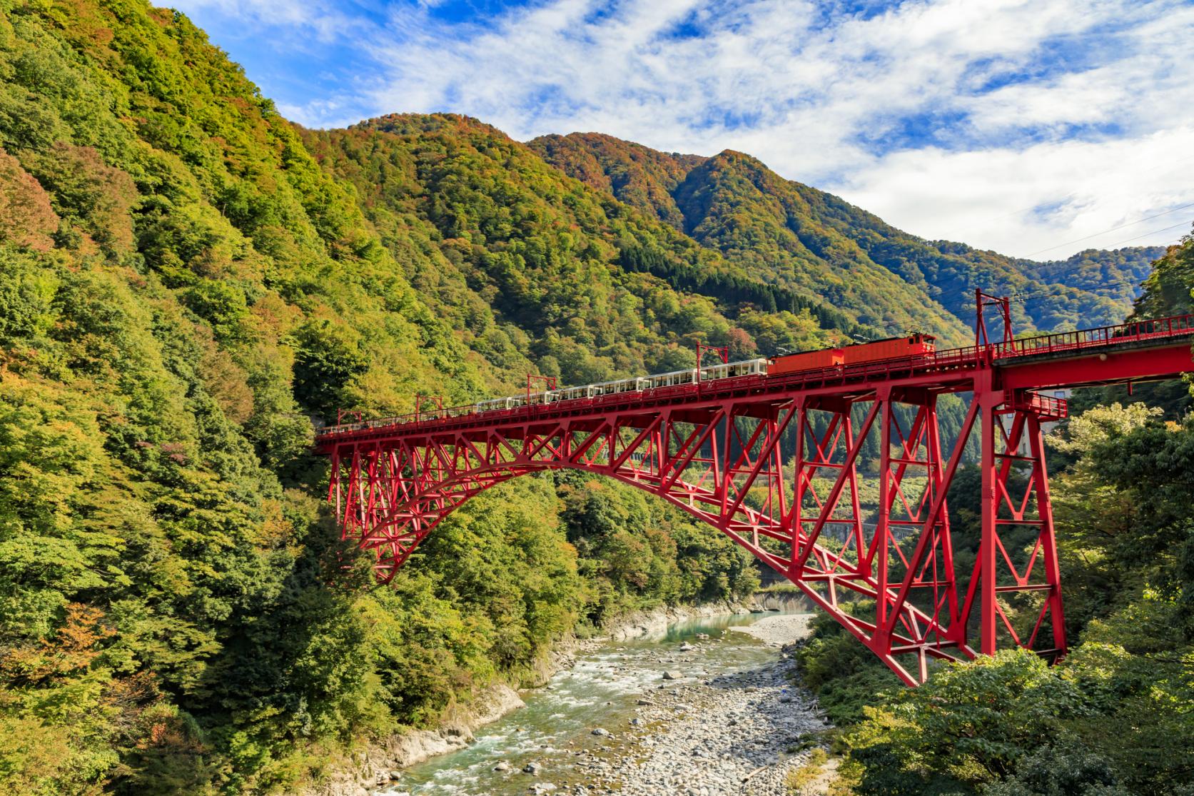 黒部川の本流に架かる朱塗りの橋は、奥鐘山や名剣山などを見渡せる絶景ポイント。高さ34mからの迫力ある景色に吸い込まれそう。欅平駅屋上展望台から見る橋の朱色と山々のコントラストも必見。