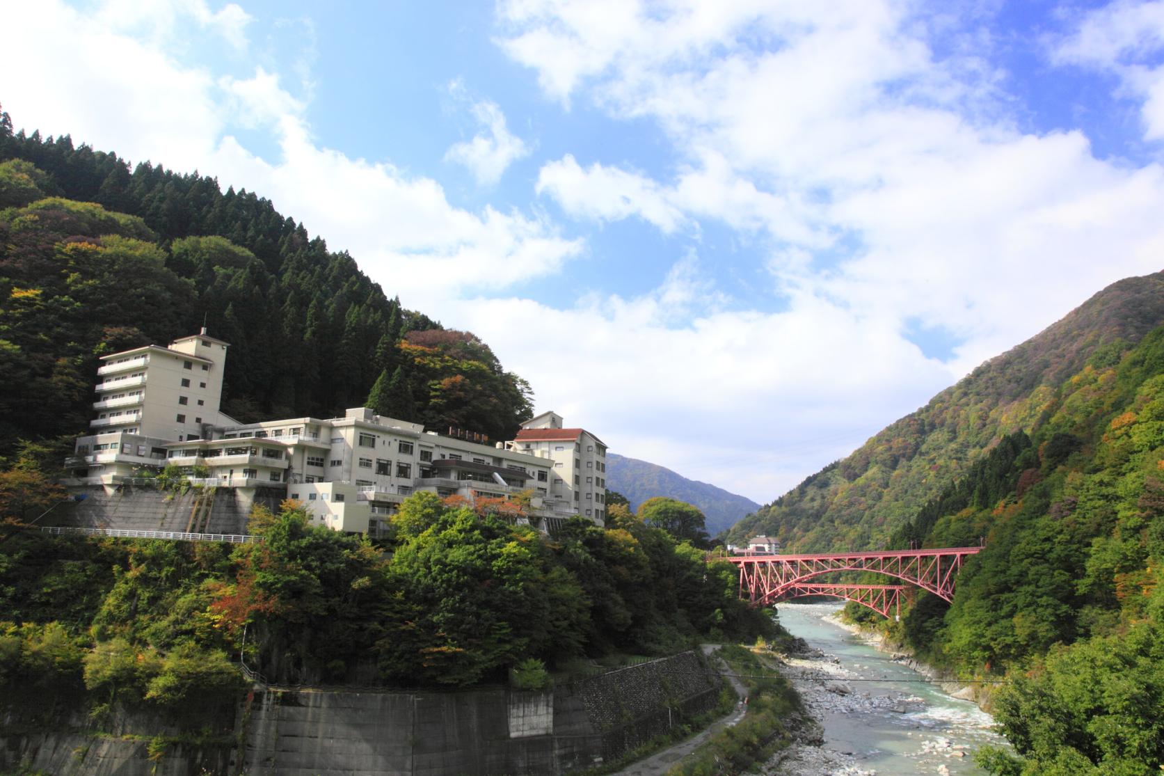 祖母谷川沿いの段崖にある名剣温泉。露天風呂は峡谷を見下ろす絶景!滝の音に耳を澄ませながら入る温泉は格別。きれいなお部屋と山菜料理に旅の疲れも癒やされます。欅平駅から徒歩約15分。