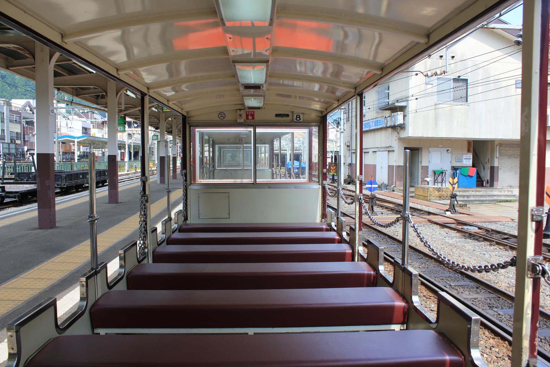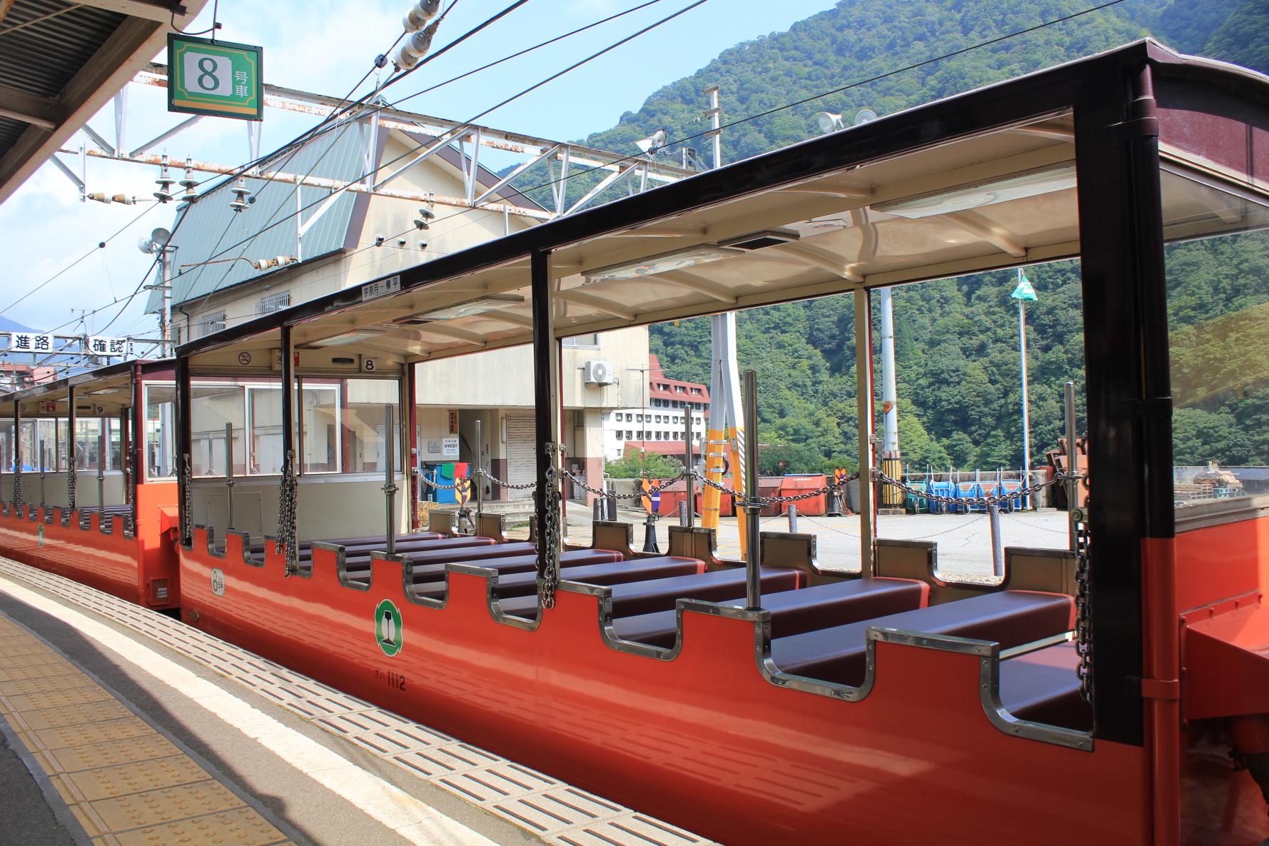 窓がないオープンタイプ。座席は横一列4人掛け。運賃のみ。車内を吹き抜ける風を感じ、黒部川のせせらぎを聞きながら絶景を楽しめます。