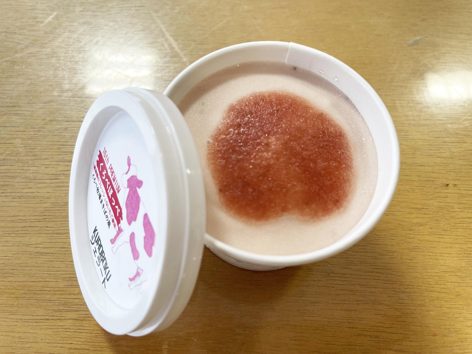 「紅ほっぺ」が練り込まれたジェラートには、「紅ほっぺ」のジュレがトッピングされています。果実味がたっぷりで、とてもフレッシュな美味しさでした。