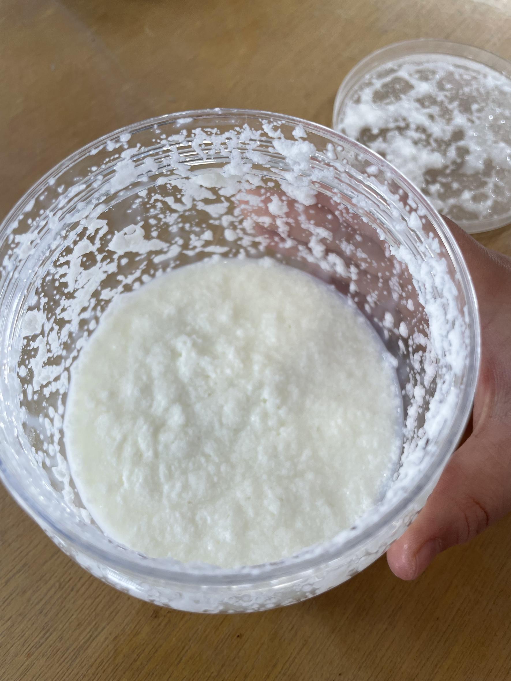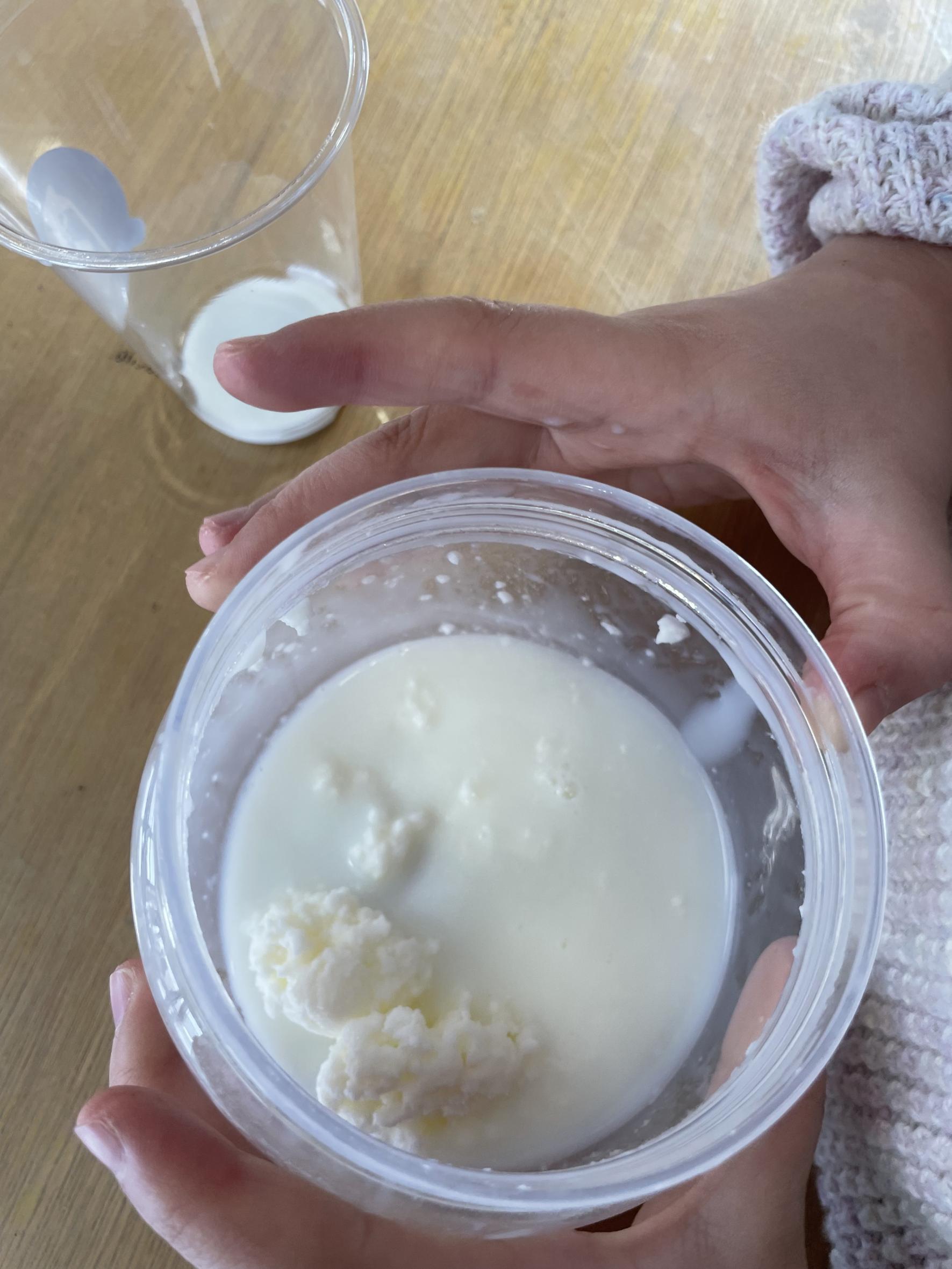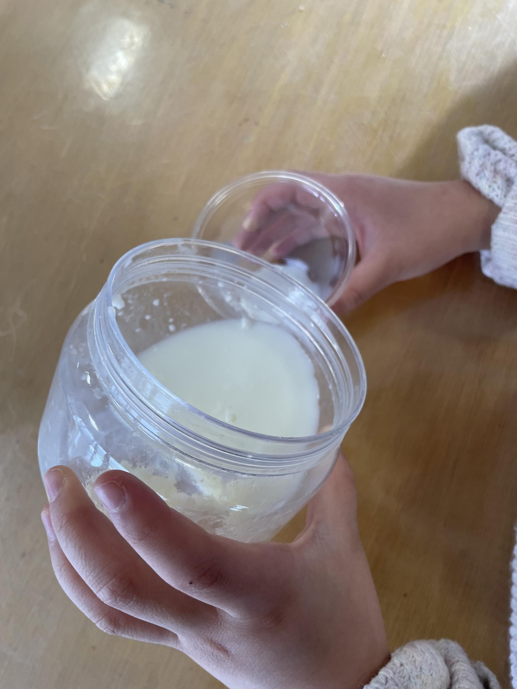 固形部分はバター。液状部分は「バターミルク」になります。副産物のバターミルクもいただきました!