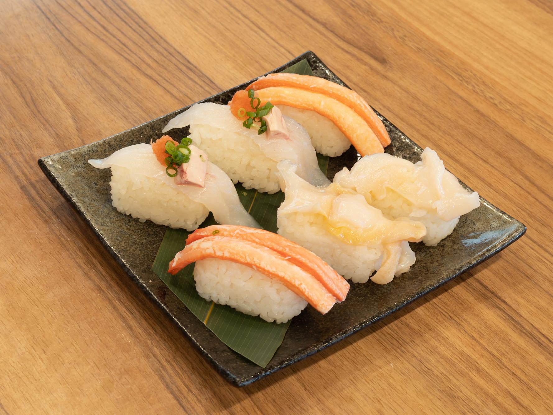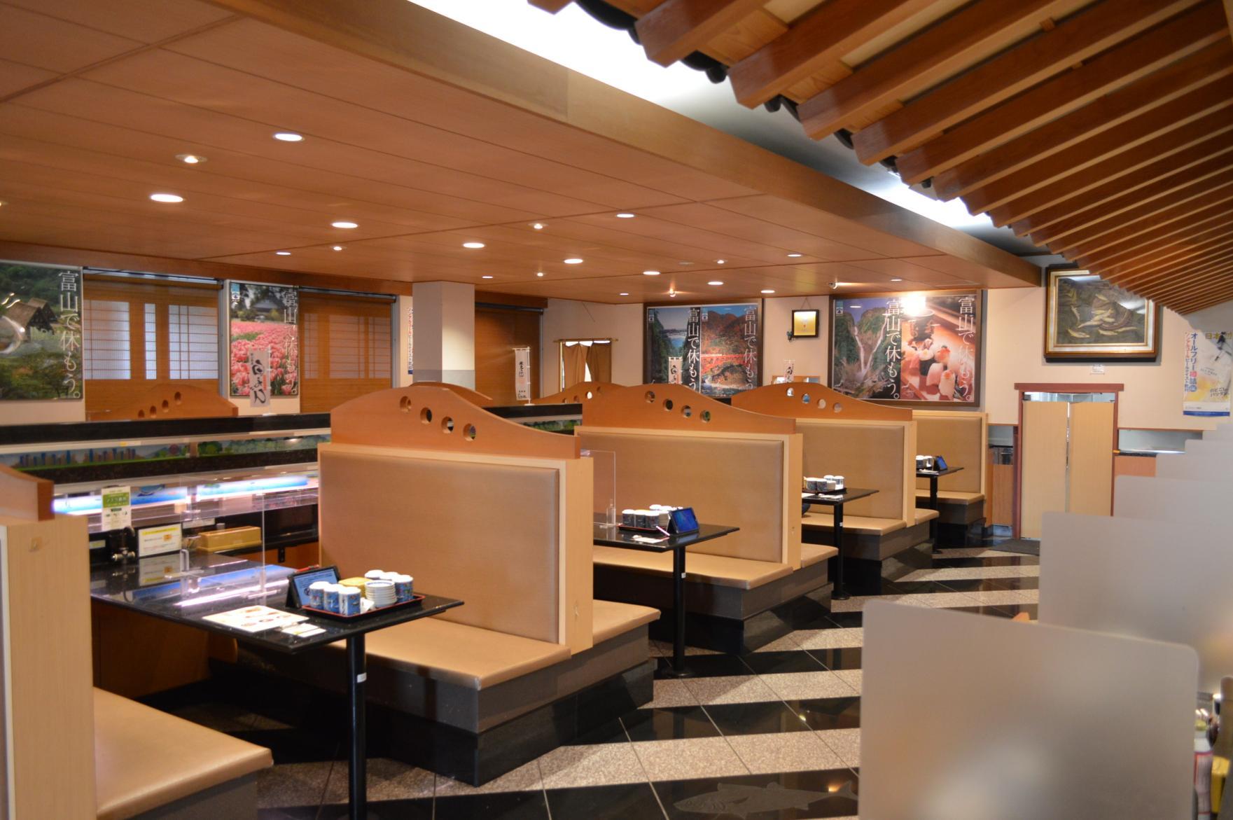 魚津で調達する旬ネタと、地元のコシヒカリを井戸水で炊き上げたシャリを使用したお寿司が提供される回転寿司です。鮮度と香りを保つ天然の「酢」と、香りと甘みを引き立たてる専用ブレンドの金沢(大野)の「醤油」が引き立てる上質で多彩な寿司は、平日限定ランチセットでさらにお得になるなど、コスパも抜群。新幹線に乗ってレーンから届く最先端の「流れる」提供スタイルは、家族連れにも好評です。