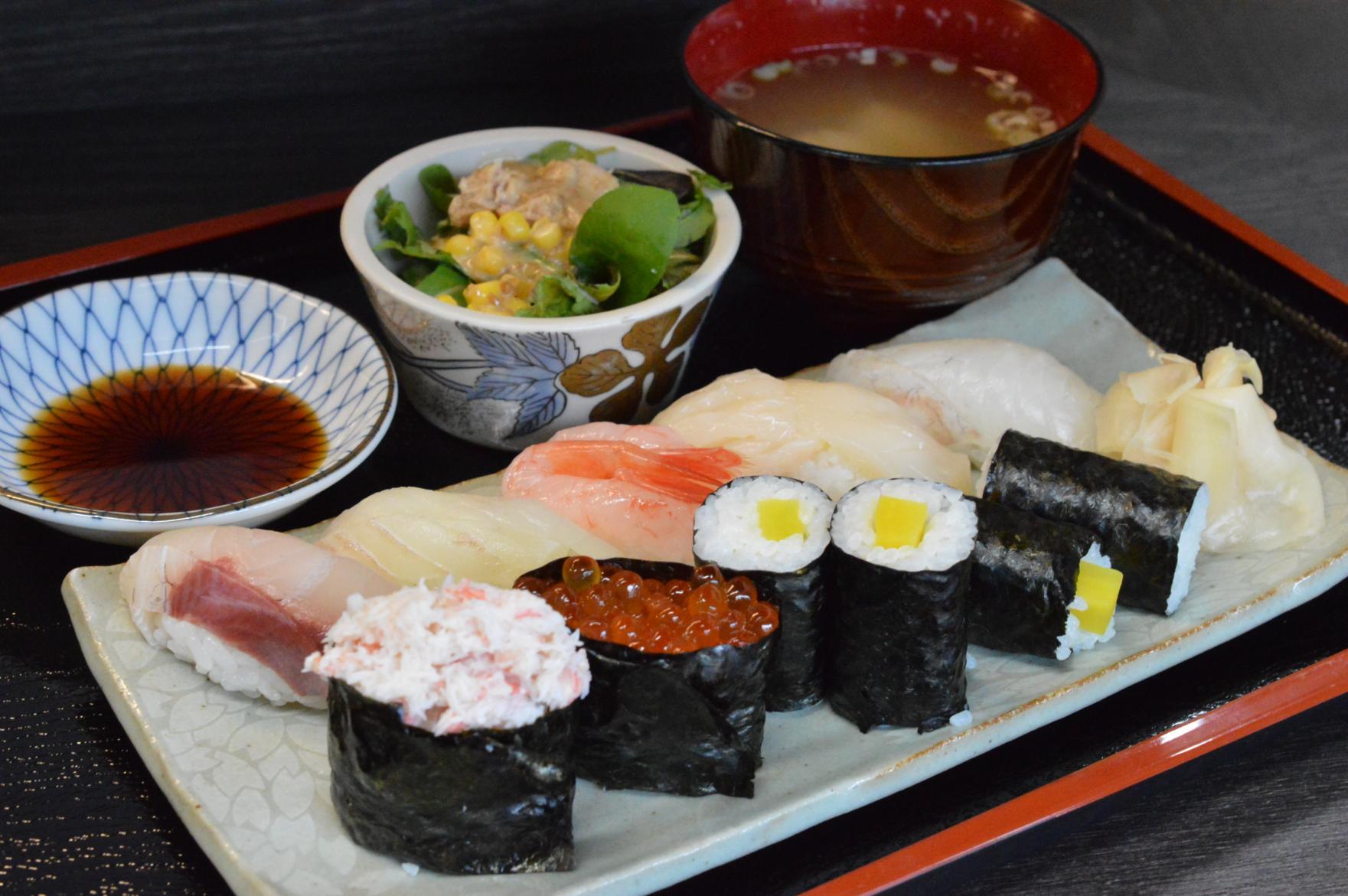 魚津漁港を中心に県内各地から仕入れる天然の旬ネタを、この道40年のベテラン職人が握ってくれる実力派の寿司処です。平日の寿司ランチは「握り」が1,000~1,800円、「ちらし」なら1,000~1,300円でともにサラダと味噌汁が付く良心的な価格設定。焼き物、酢の物、カニ料理、焼き魚など旬の一品モノを用意しており、宴会なら鍋物にも対応可能です。観光シーズンは県外・海外客でも賑わっています。