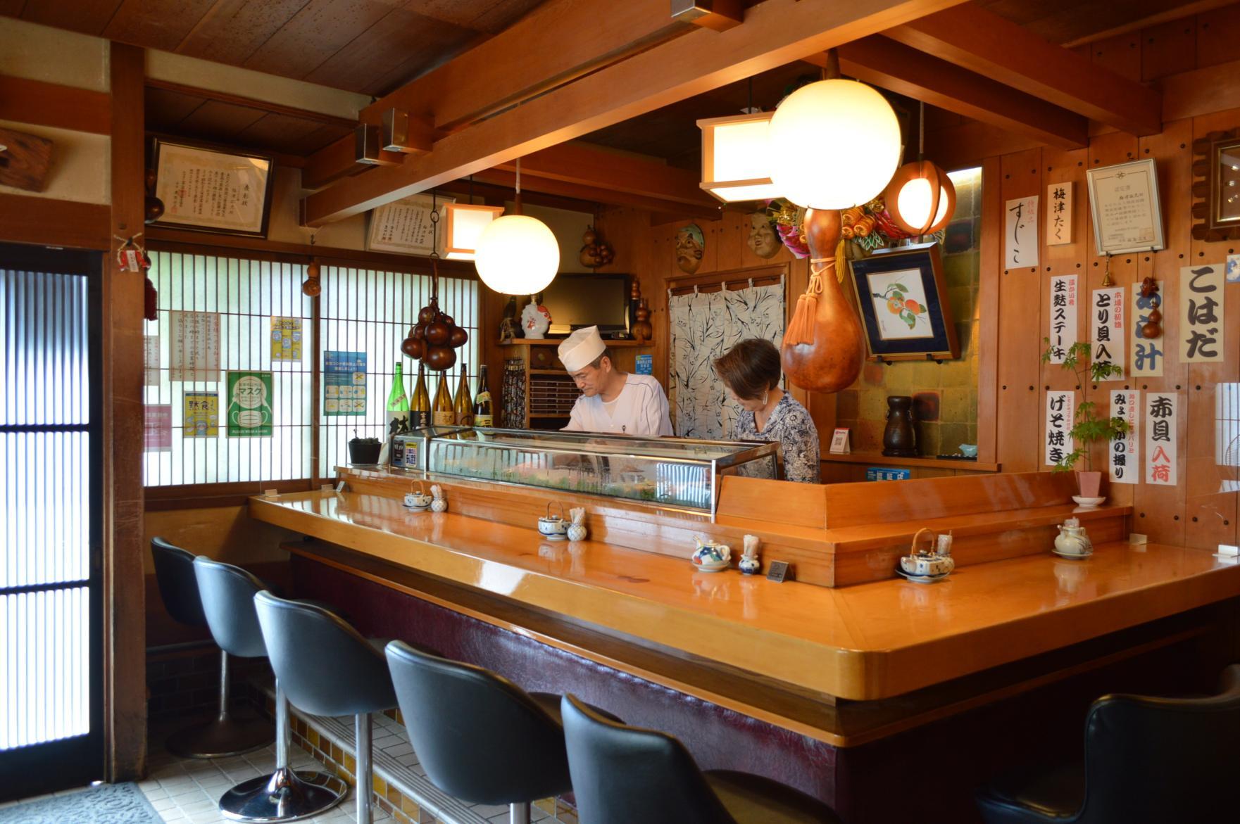 朝日町でお店を構えて46年の老舗です。店主の梅津さんは、毎日真剣にお寿司と向き合い、自分なりのこだわりと技術を磨き上げていらっしゃいます。じっくりと時間をかけて仕込んだ新鮮な魚介を、卓越した技術で素早く丁寧に握っていく姿はまさに圧巻。地元の人はもちろん、遠方からわざわざ訪れるファンも多く、その味わいだけでなく人情溢れる雰囲気はきっとまた訪れたくなるはずです。