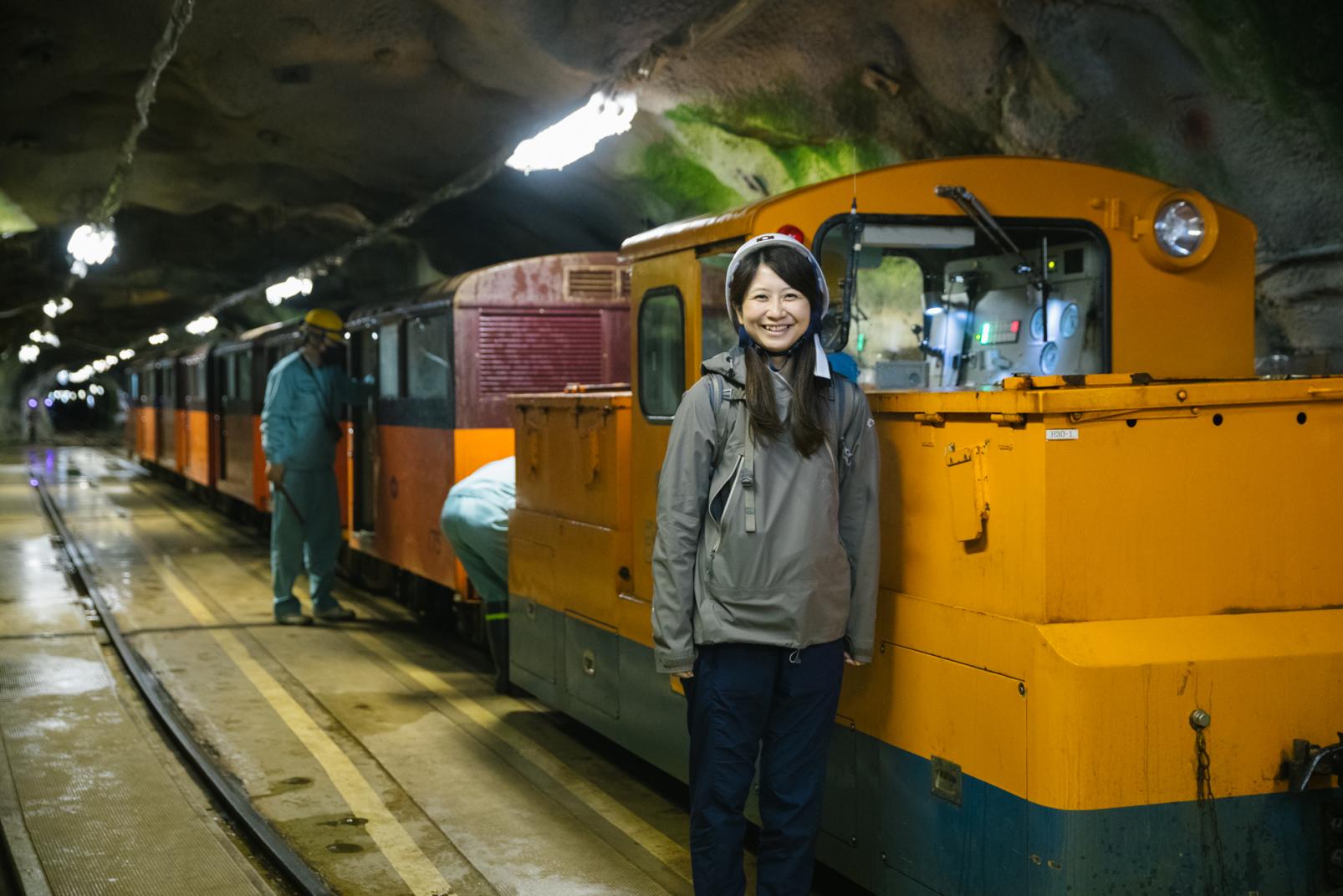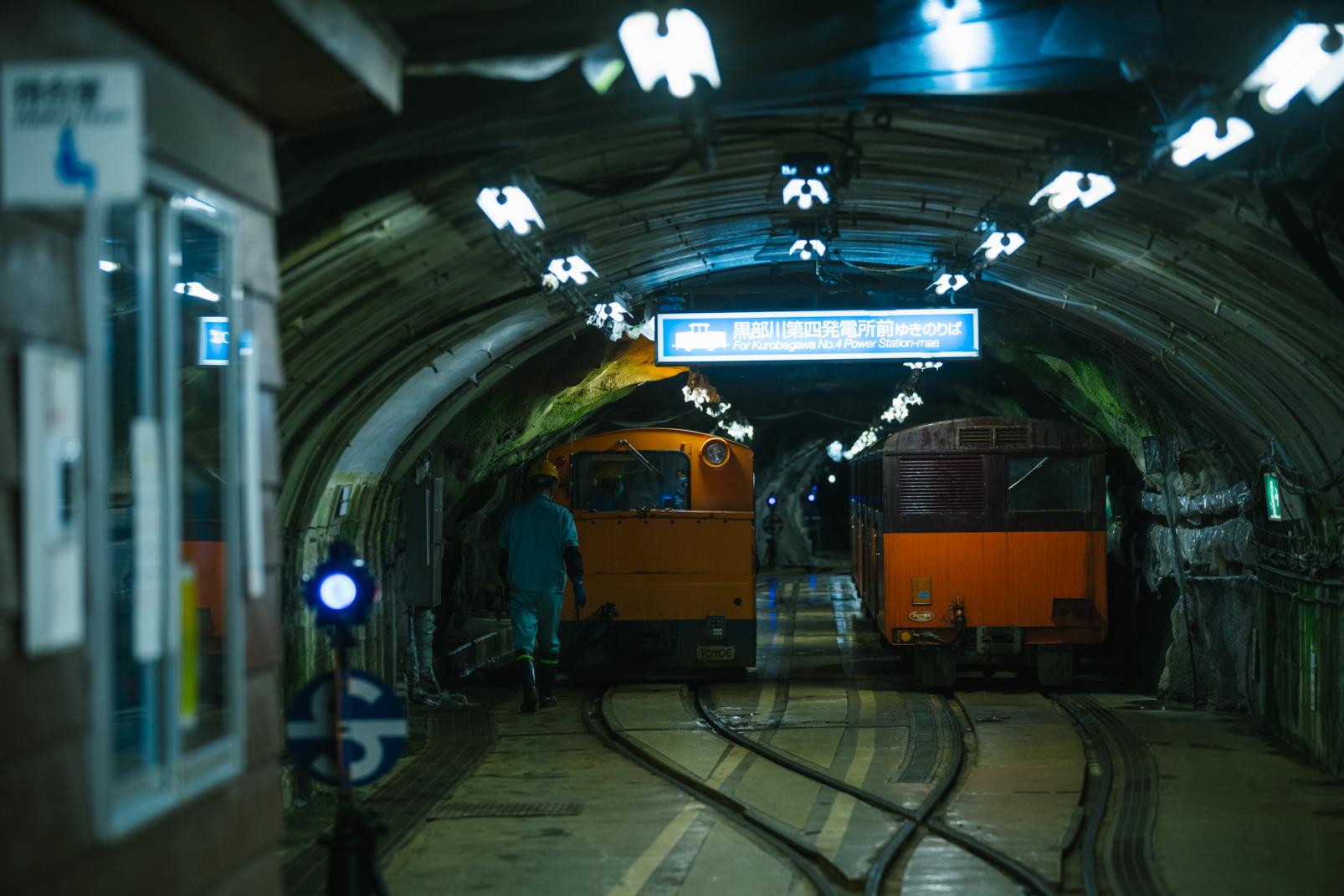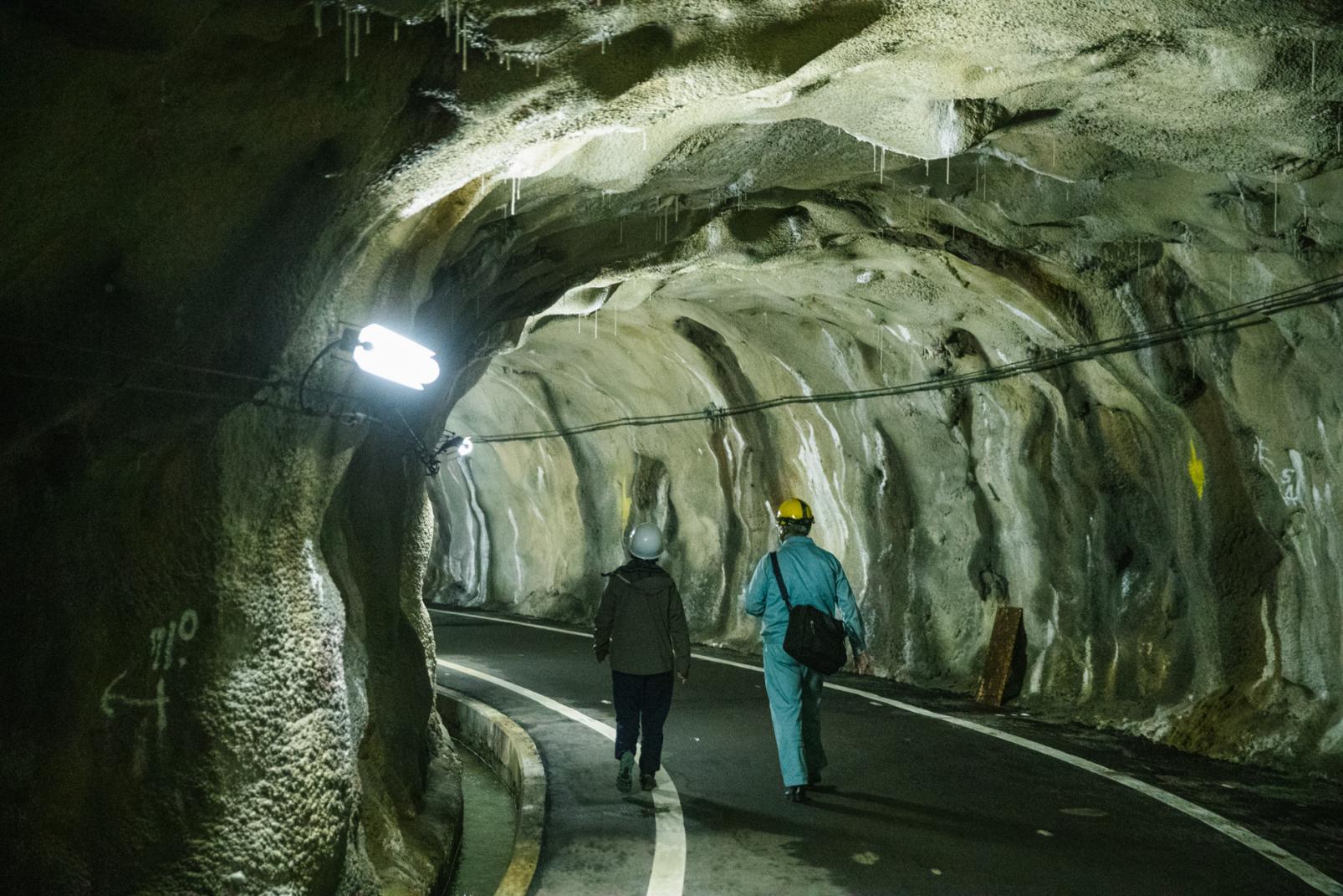 今回取材をした「黒部宇奈月キャニオンルート」の始発点は、黒部ダム観光の乗降地である黒部ダム駅。駅に到着すると専用の入り口へと誘導され、ヘルメットを被って荷物のチェックを受けます。案内された先にあったのは、黒部川第四発電所へとつながる黒部トンネル。専用のバスに乗って全長10.3kmの薄暗い一本道を進みます。黒部トンネルには5ヵ所の横坑があり、トンネルを掘削したときの土砂はそこから外へ出していたそう。タル沢横坑への分岐点でバスから下車。200mほど歩いて横坑を進みます。