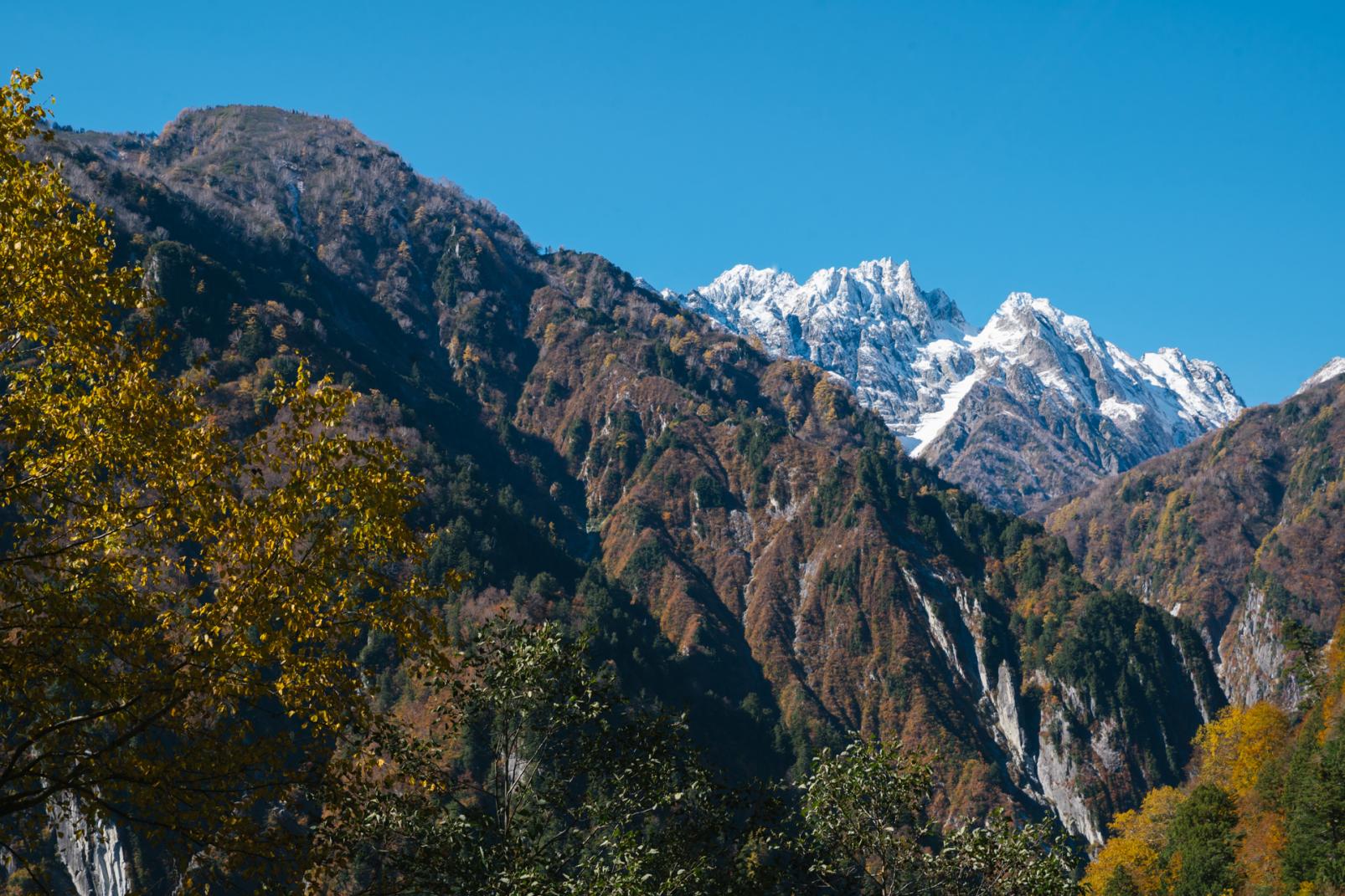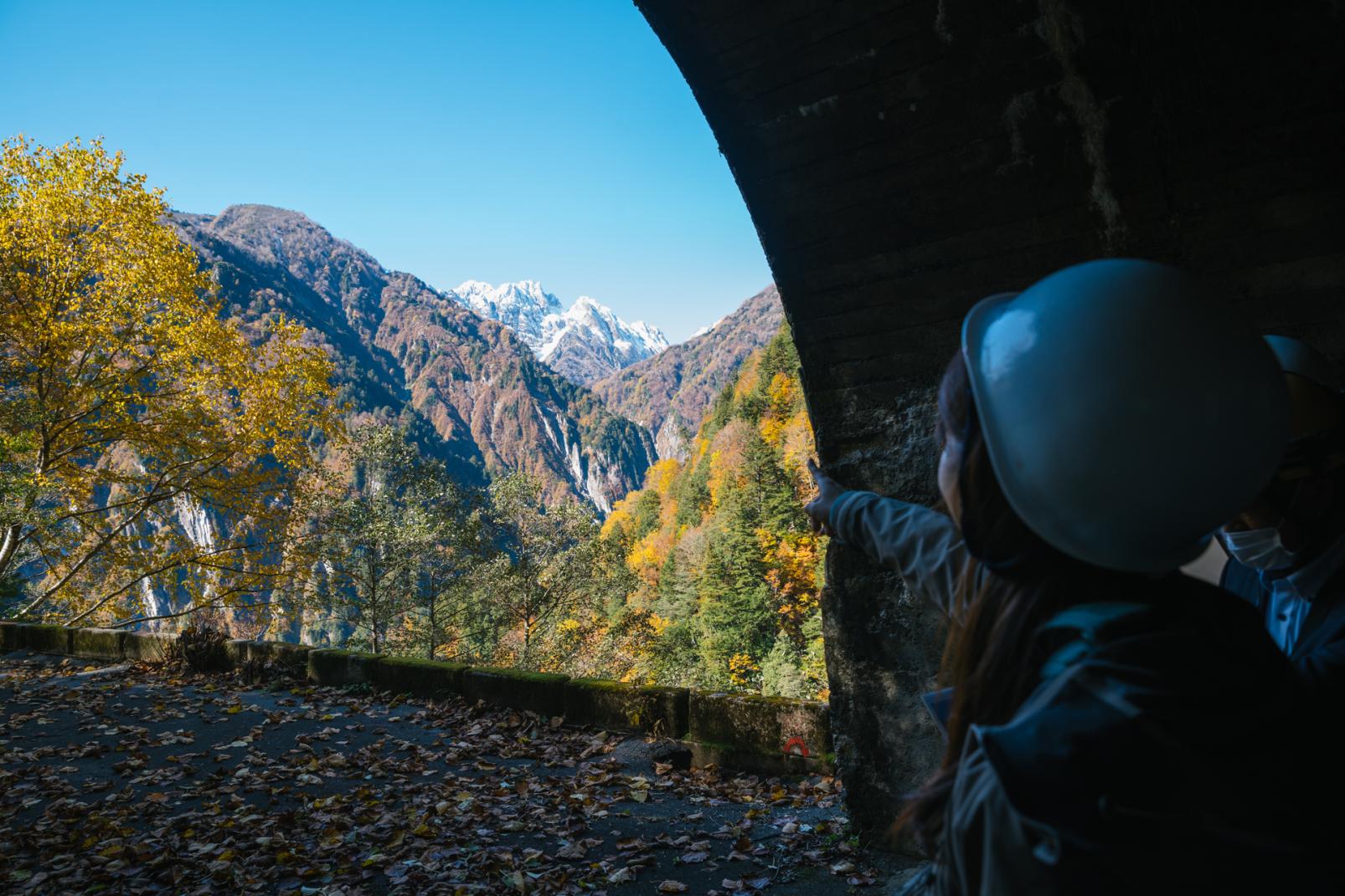 横坑を進むと、視線の先に切り立つ岩峰に雪を被った剱岳が飛び込んできます。富山平野と反対側の方向から望む剱岳は「裏剱」と呼ばれ、息をのむほど美しい絶景は、本来ならば険しいルートに挑む登山者しか目にすることが出来ない特別な景色です。