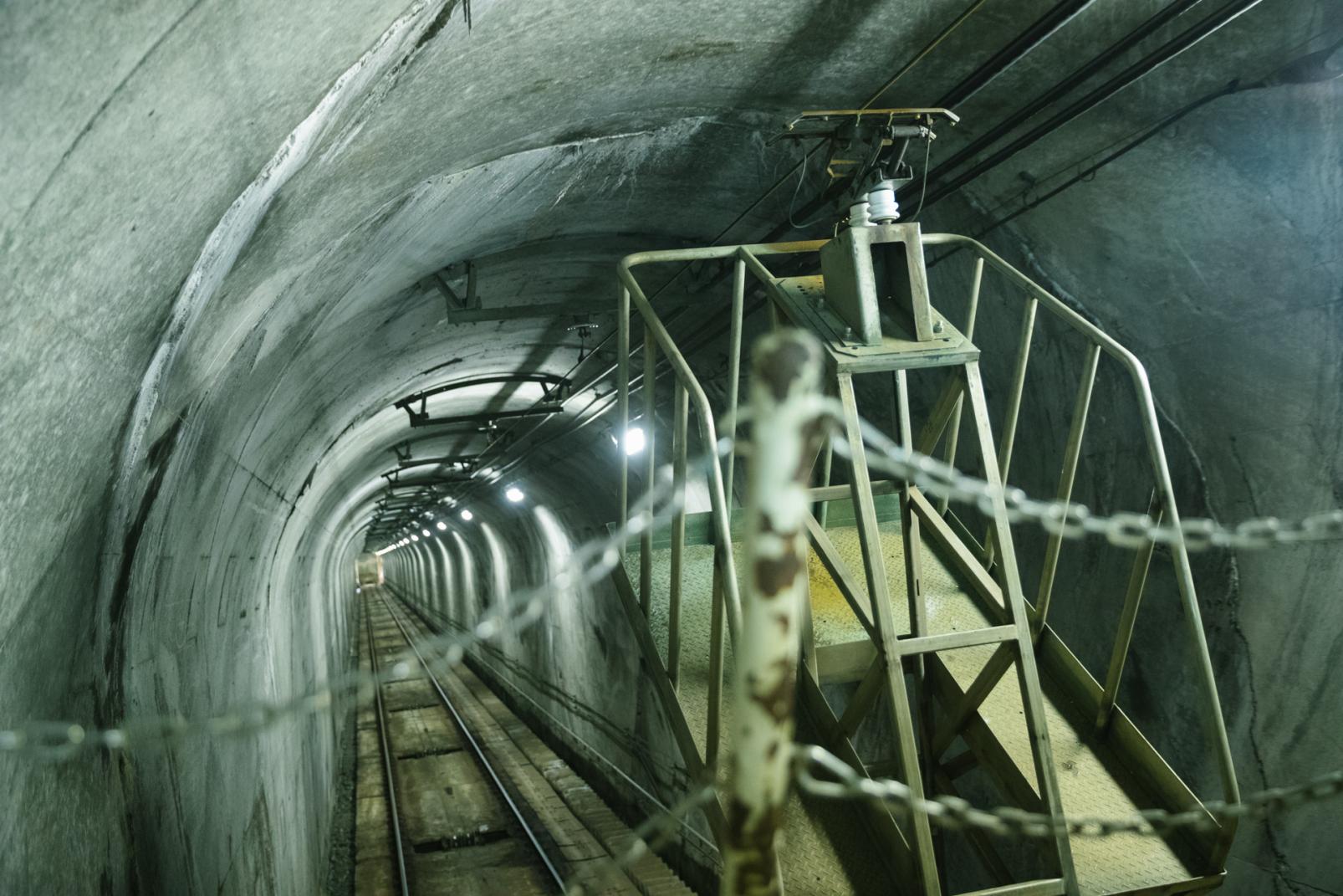 窓から眺めていると、まるで深部へ落ちるように進み、急傾斜の具合がよく分かります。単線を上下から車両が行き来していて、2台のインクラインが行き交う中間地点まで進むと、シルバーの運搬車の迫力のある構造体の全容を知ることができます。