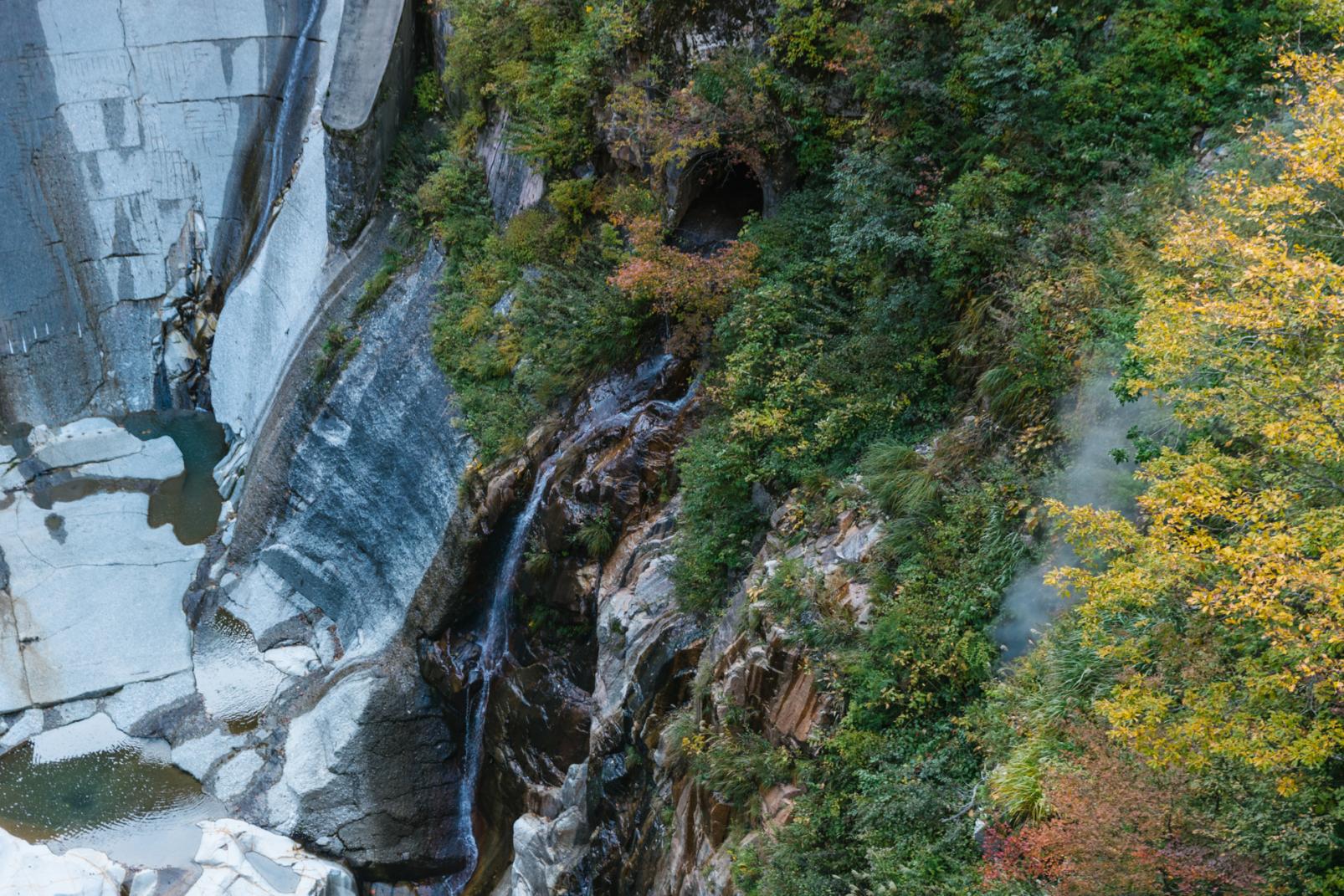 ところどころに見える白い湯気は、温泉が自噴している場所。ここは黒部峡谷沿いを通る登山道である水平歩道と日電歩道、雲切新道の合流地点でもあります。