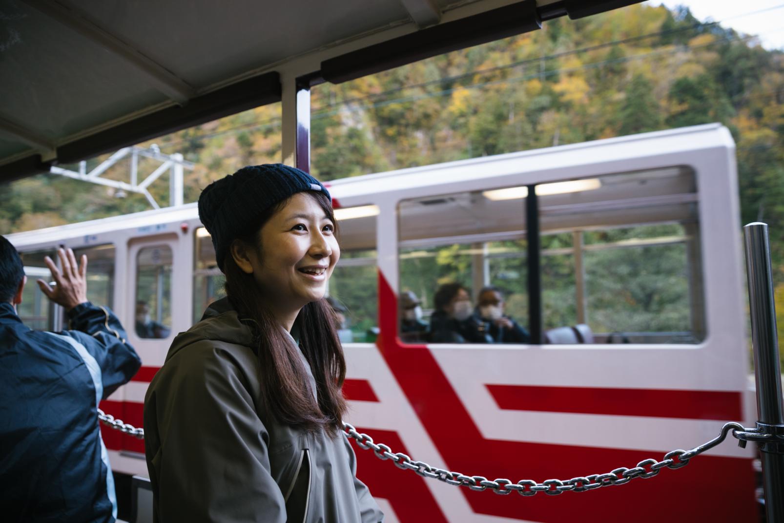 欅平下部から工事用トロッコ電車で欅平駅に到着。欅平駅からは、黒部峡谷トロッコ電車に乗ります。オープン車両に乗れば、初夏は新緑、秋は紅葉が楽しめ、心地いい風を肌に受けることができます。すれ違う電車の乗客と手を振り合うのも楽しい時間。ガタンゴトンと音を響かせながら、電車は峡谷を縫うように下っていきます。