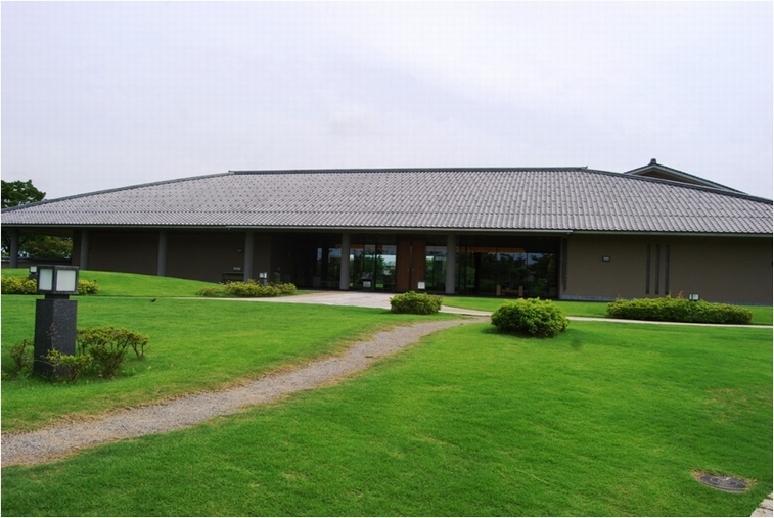 スポット情報緑の芝生が広がる中庭、平屋瓦葺の和風建築。