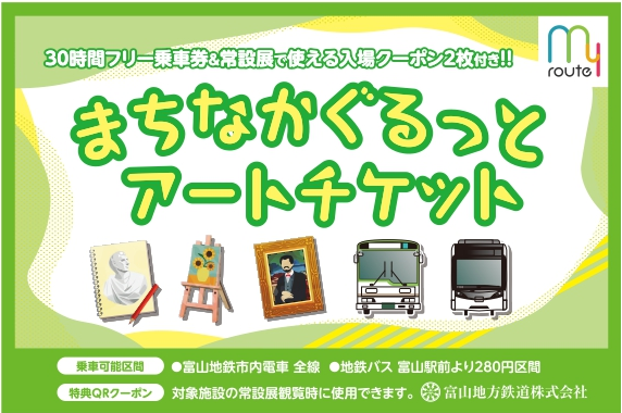 富山地鉄市内電車全線と富山駅前からの路線バス280円区間が30時間乗り放題できるフリー乗車券と、富山市内の対象文化施設の常設展に入れるQRコード2枚がセットのクーポンです。