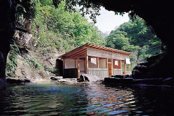神通峡沿いに湧く温泉は、切り傷や火傷、慢性婦人病などに効能があるというナトリウム・炭酸水素塩・塩化物泉。肌がなめらかになると評判です。