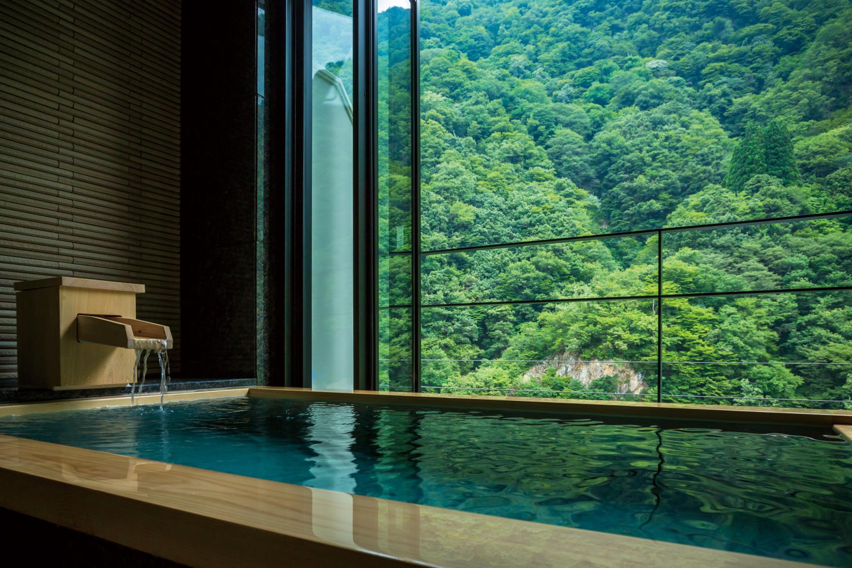 樹齢400年のヒノキで造られた露天風呂から四季折々の峡谷美が望め、湯鏡に映った絶景につかる贅沢な体験が味わえる他、客室露天風呂からも絶景を堪能できます。