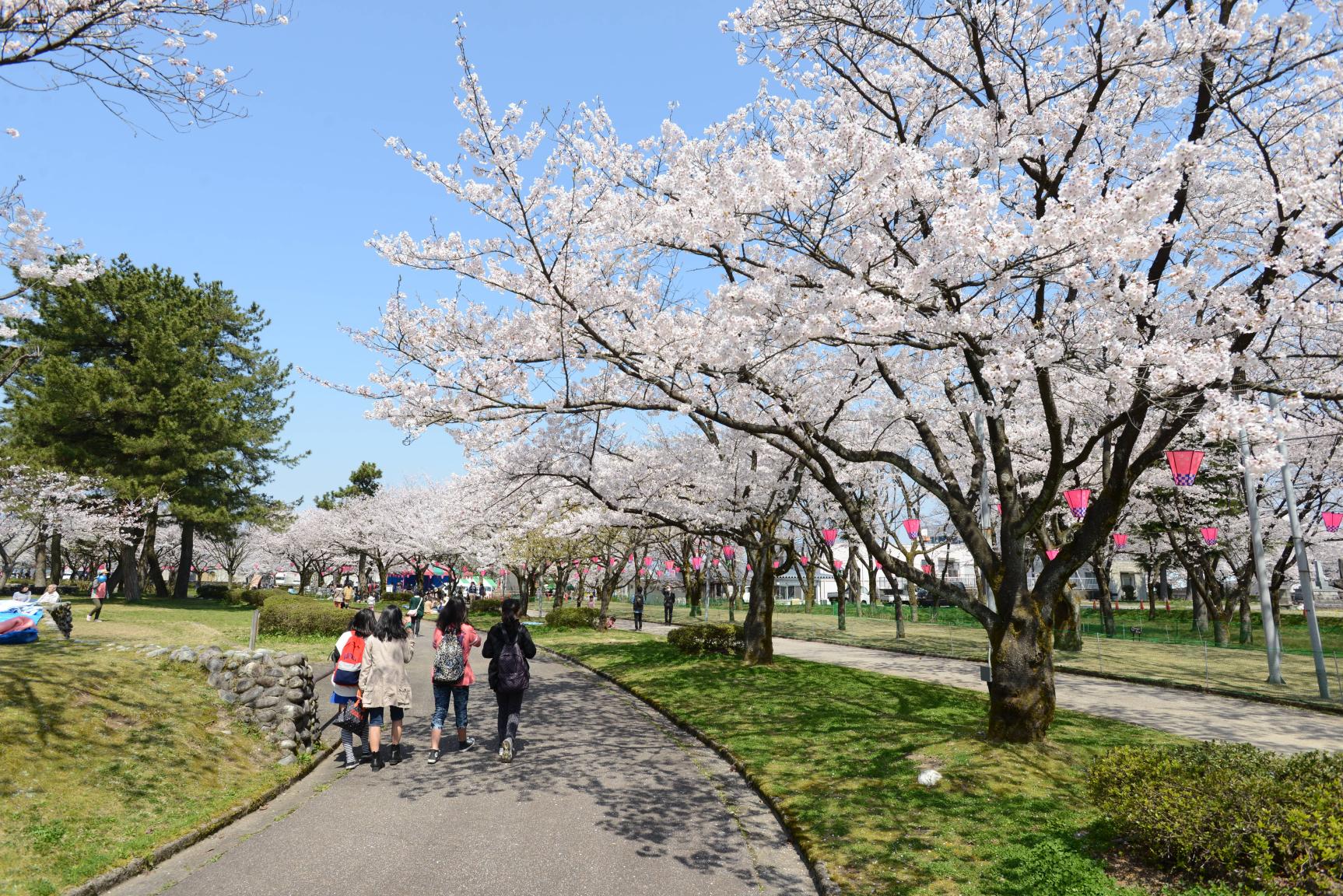 高岡市街地のほぼ中心に位置し、加賀前田家2代当主前田利長が築いた高岡城の城跡。18種類、約1,800本の桜が植えられ、「日本さくらの名所百選」でもあり、桜の名所として知られています。 -
