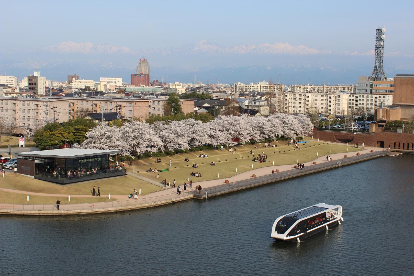 富岩運河環水公園では、桜の下でのお花見や散策はもちろん、展望塔からは桜と立山連峰を一望できるほか、夜間にはライトアップもされます。また、富岩水上ラインでは、桜を眺めながら運河クルーズが体験できるなど、桜を多彩に楽しむことができる公園です。 -