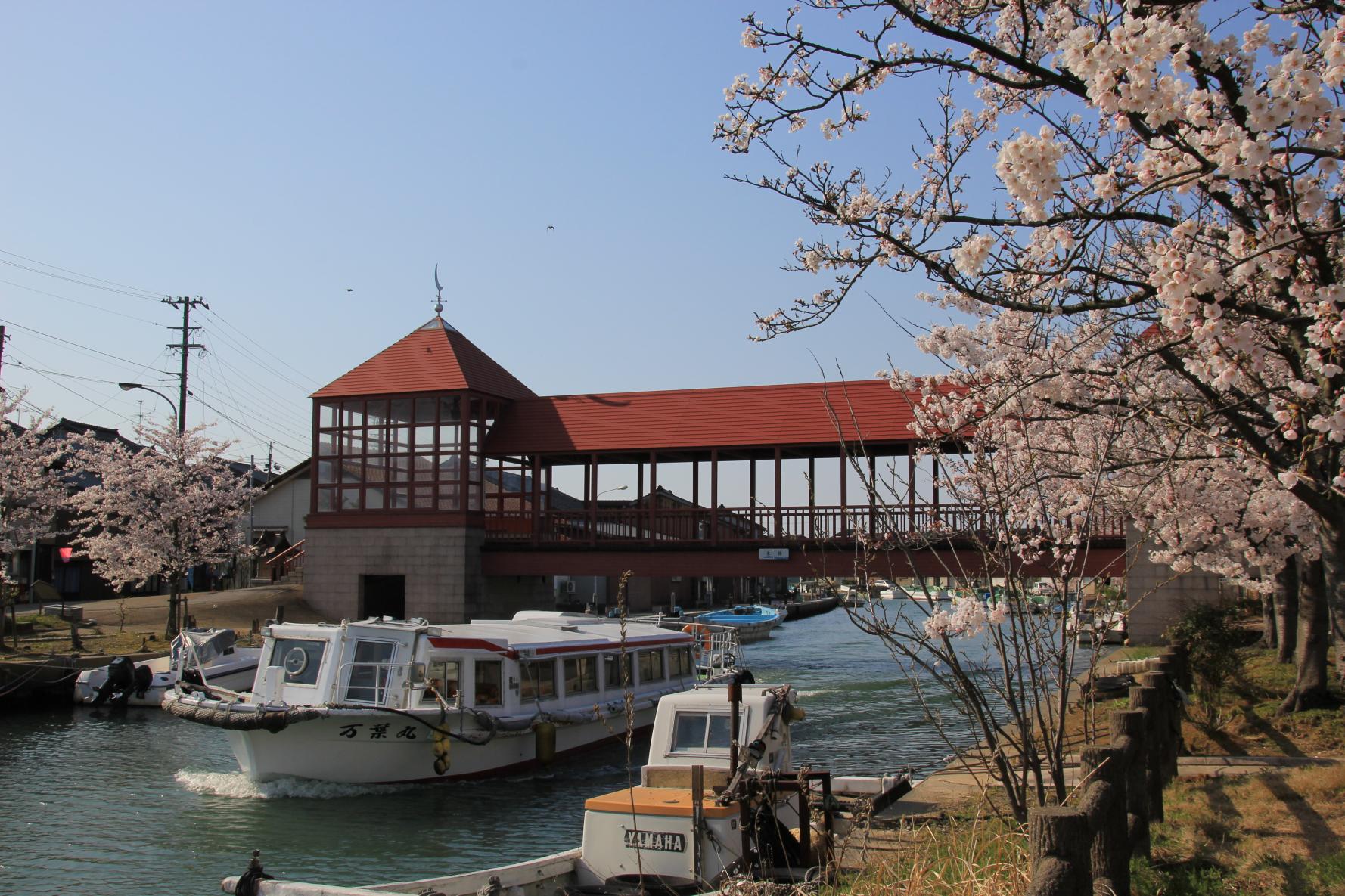 内川に架かる切妻屋根で覆われた「東橋」や室町時代の歴史ロマンを感じさせてくれる「放生津橋」とともに内川両岸に約600mにわたって続く桜並木をお楽しみいただけます。水面に映る桜を遊覧船から眺めることもできます。 -