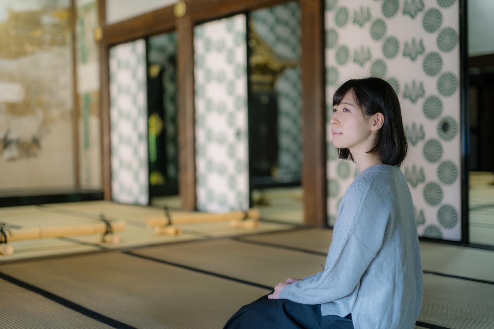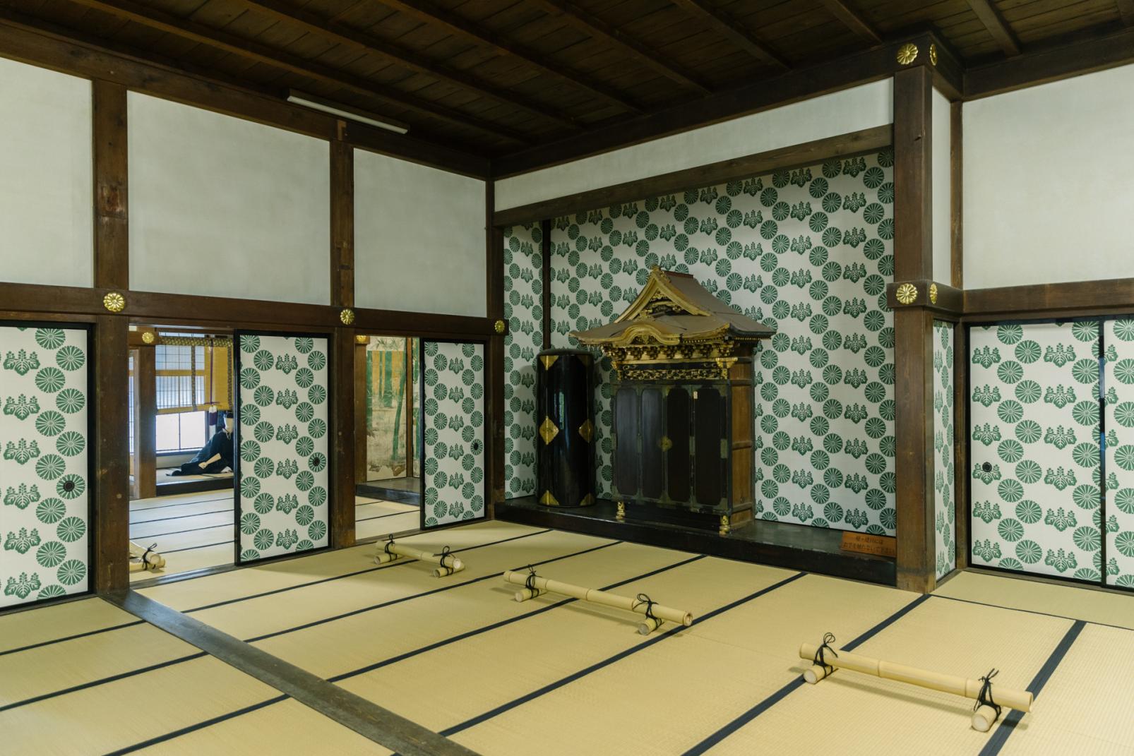大広間及び式台も、本堂と同時に国宝指定を受けました。大広間には、格式の高い浄土真宗の対面所があります。国宝指定の理由は「勝興寺」の発展にともなって、拡張整備が行われた過程を色濃く残していることが評価されたからです。現在、大広間の畳が敷かれている部分はかつて2列でしたが、門徒の増加と寺院規模の拡大により、後になって広間は3列に整備されました。鮮やかな桐と菊が配置された襖(ふすま)は、もともとあった襖紙を外したところ、数枚下にあった襖紙がこの色柄だったことから再現されたものです。