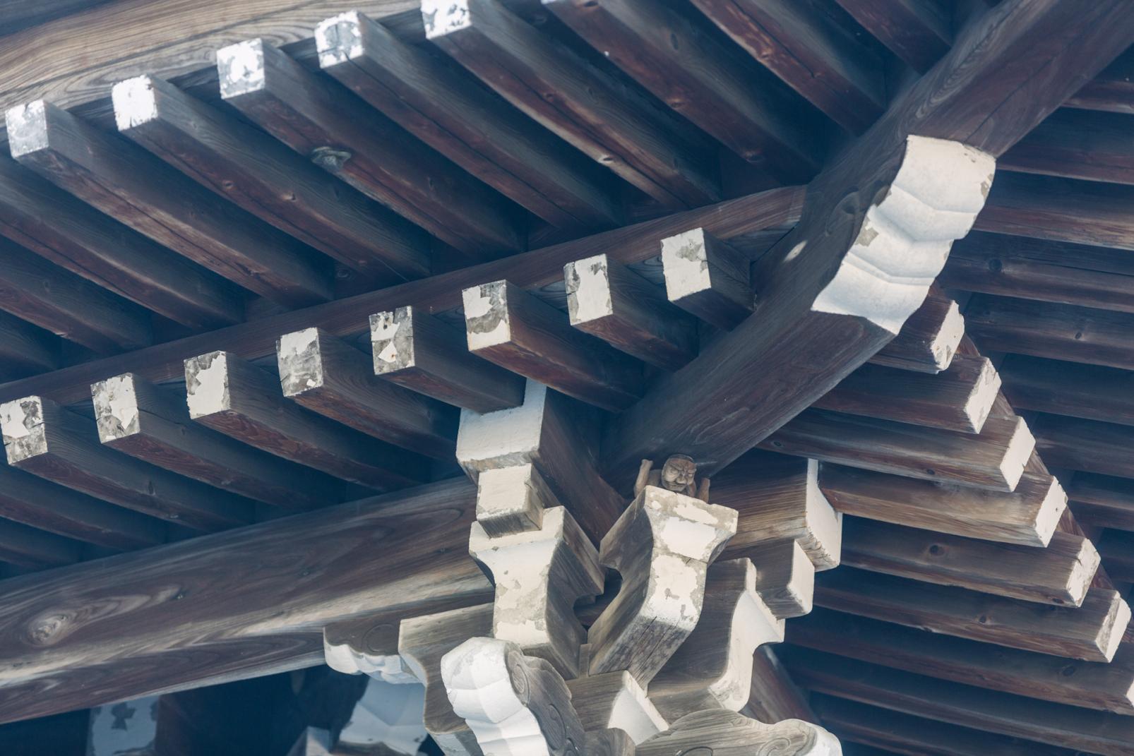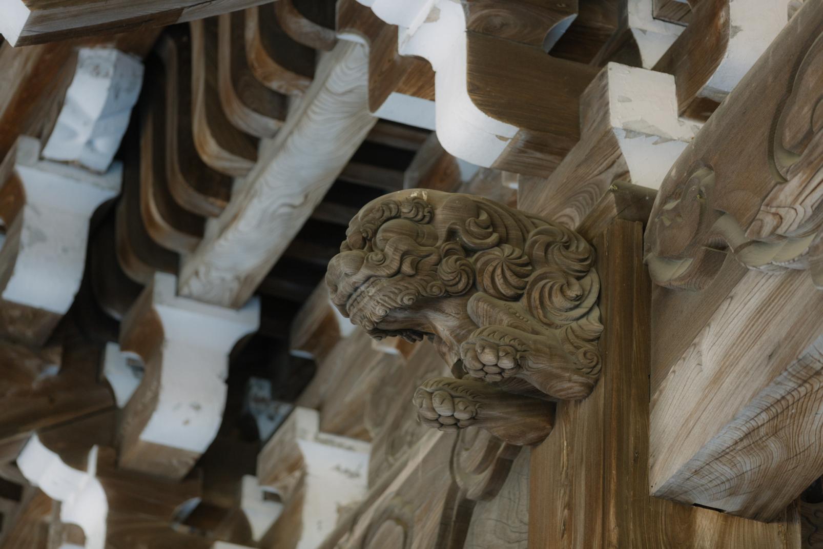 ●屋根を守る邪鬼:本堂の四隅の柱上部にある彫刻で、本堂前側2体は両手、後ろ側2体は片手で屋根を支えています。魔除けの意味を持っています。