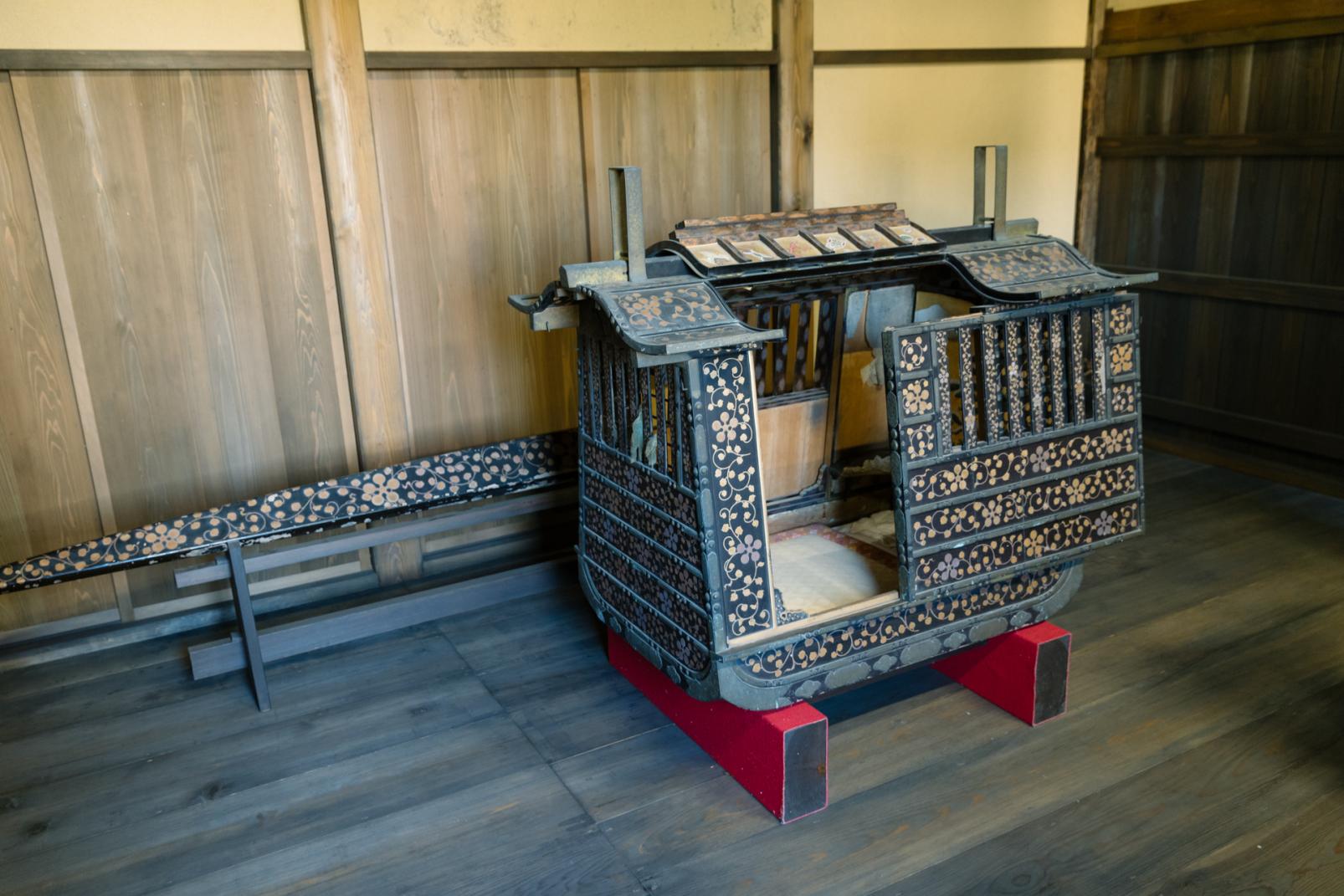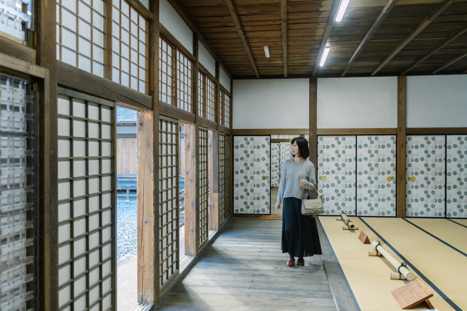 国宝に指定された本堂と大広間及び式台とともに、重要文化財10棟も保存修理が行われました。復元前は多くの建物が瓦葺き屋根でしたが、総門が瓦なのを除き、唐門(からもん)が檜皮葺(ひわだぶき)、そのほかは柿葺(こけらぶき)になりました。台所に床の上から使う特殊な井戸があったり、廊下脇に治脩(はるなが)が乗ってきた籠が置かれていたりと見どころが豊富にあります。伽藍(がらん)の建築物を巡っていると、住宅建築としての質の高さにも気づくことでしょう。
