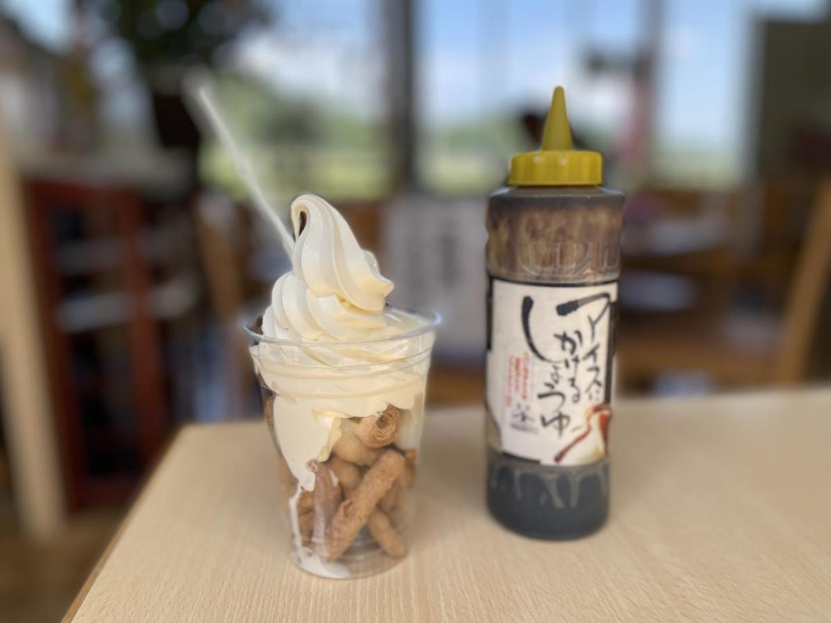 小矢部市の道の駅「メルヘンおやべ」にあるフードコート「田舎」で販売されている「とろっとソフト」は、驚きと話題性たっぷりのユニークな一品です。ポン菓子の上にソフトクリームと温泉卵がトッピング。仕上げに専用の“アイス用しょうゆ”をひとまわししていただくと、甘さと塩気が絶妙に絡み合う、新感覚の味わいを楽しめます。