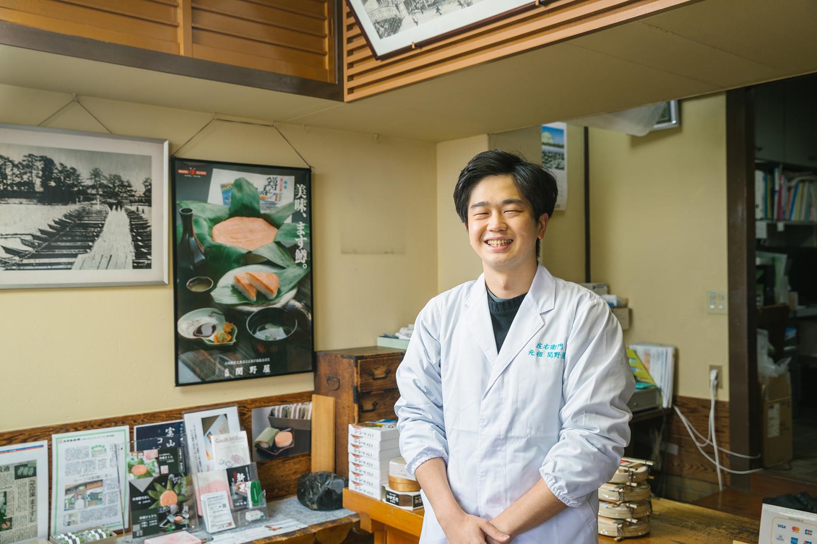 創業以来、製法と技を脈々と受け継いできた『元祖 関野屋』。天然サクラマスと富山県産コシヒカリを使い、従来の味わいを守っています。神通川に遡上するサクラマスの漁獲量が減ってからは、北海道沖の船上で神経締めされた魚を使うことでお客さんを満足させてきました。7代目の関野伸也さんは、東京にある富山県のアンテナショップで働いた経験の持ち主です。「ます寿し」を買い求める生の声をたくさん耳にしました。首都圏の人たちの声を生かし、近年は冷凍商品なども生み出して、富山の「ます寿し」界に新たな息吹をもたらしています。