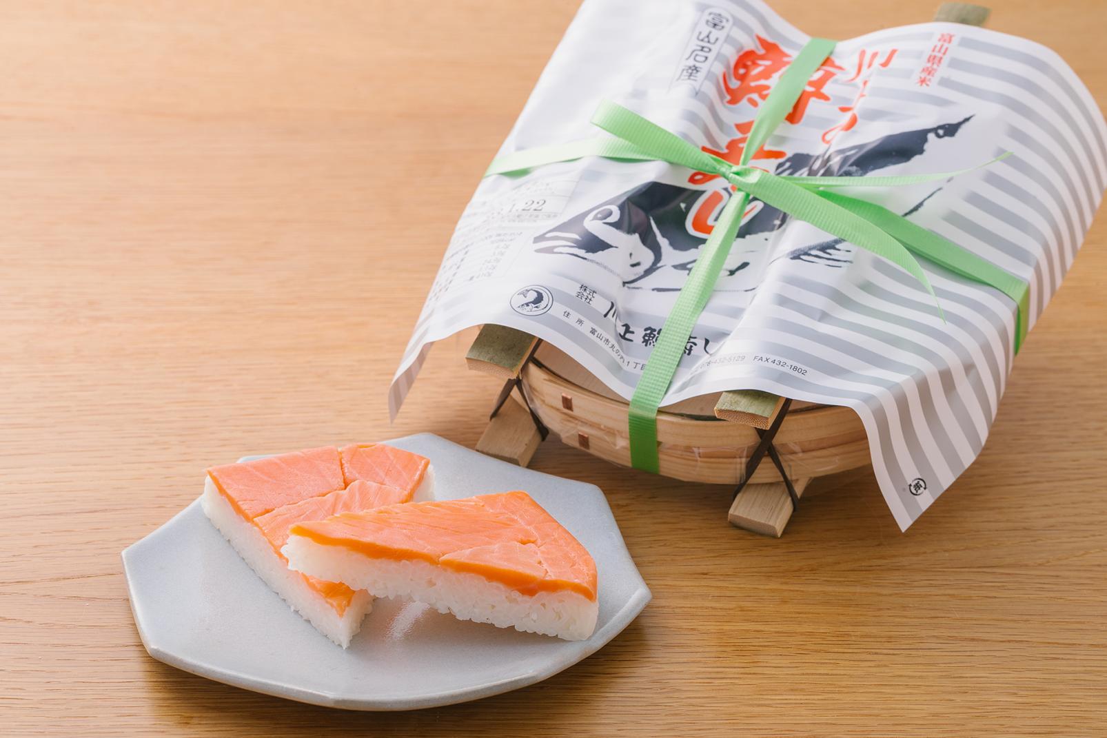毎朝6時半に店が開く『川上鱒寿し店』は、早い時間帯に県外へ出発する人にとても重宝されています。マスは肉厚で酸味の少ない素朴な味付け、お米は富山県内でも自然豊かな場所で実ったコシヒカリを使っています。酢飯の粘りと甘さが、マスの酢加減と相性がいいのが魅力です。店頭に置かれた25kgある青石は、毎朝「ます寿し」を押すのに使うもの。創業者が神通川の上流で拾ってきた、店の家宝でもあります。3代目の川上弥さんは、バックパッカーで世界を旅した経験を活かし、観光やビジネスで店を訪れた人たちに「富山に来てよかった」と感じるような接客を心がけています。