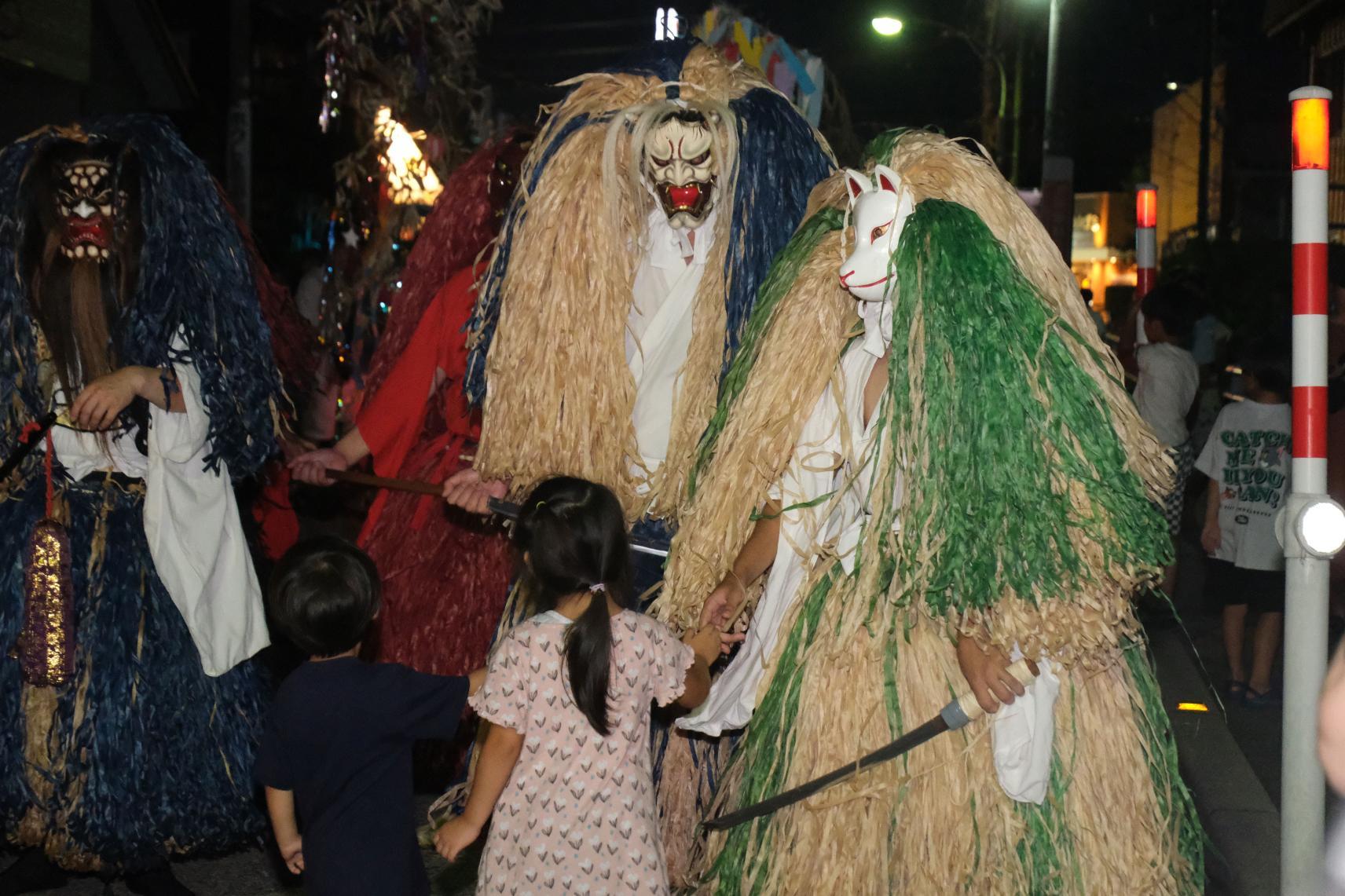 1913年から続く伝統行事で、太鼓や七夕飾りを持った人々が町を練り歩きます。「あじろ」をまとった神様と握手すると、それぞれ異なるご利益があるとされ、毎年多くの人でにぎわいます。