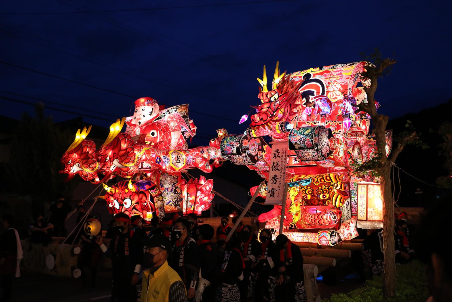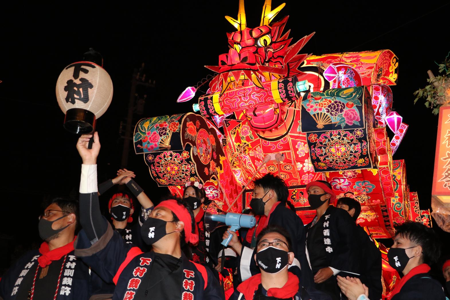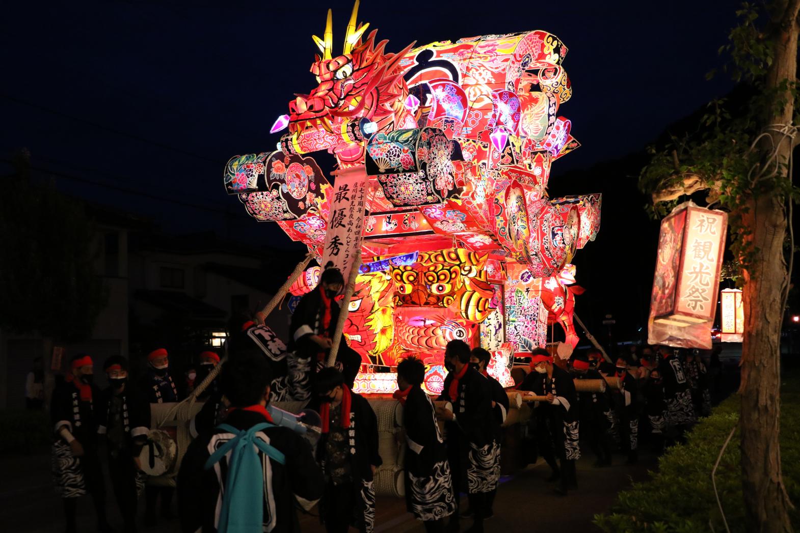 祭りのメインは高さ7m、長さ12mの大行燈同士が激しくぶつかり合う喧嘩夜高あんどん引き回し。轟音と各町内の溢れる気迫は観客を熱狂の渦に巻き込みます。宵闇に映える行燈の灯りと豪快な引き回しのコントラストは見ごたえ十分。 -