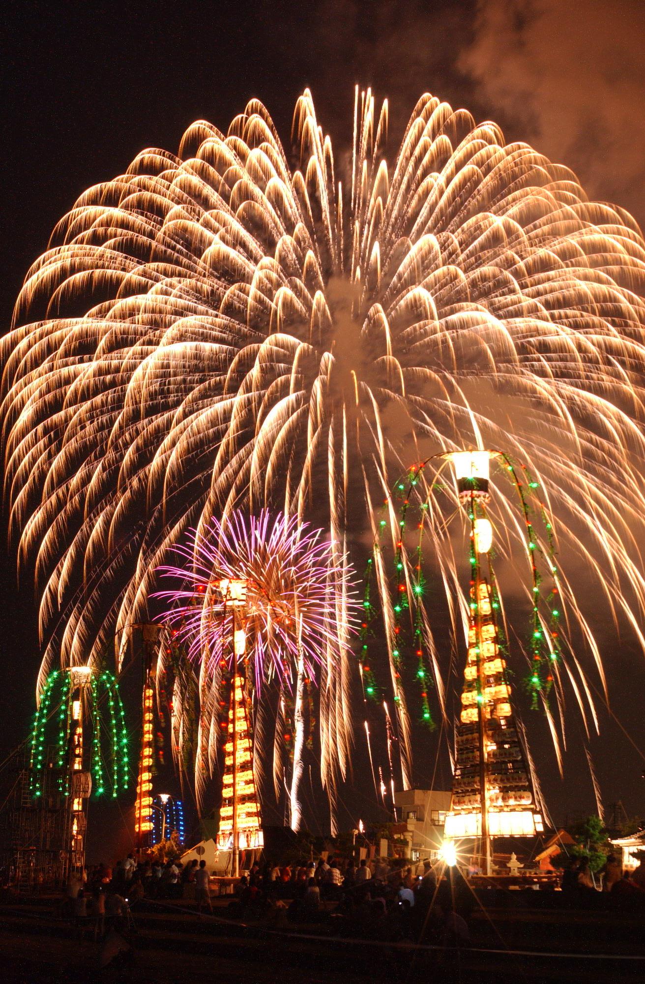 初日には県内で最も早く花火大会が行われ、豪華絢爛な夜高行燈と花火の競演をご覧いただけます。夜には夜高行燈の街練り、行燈同士がぶつかり合う「合わせ」が行われ、庄川地区は熱気に包まれます。