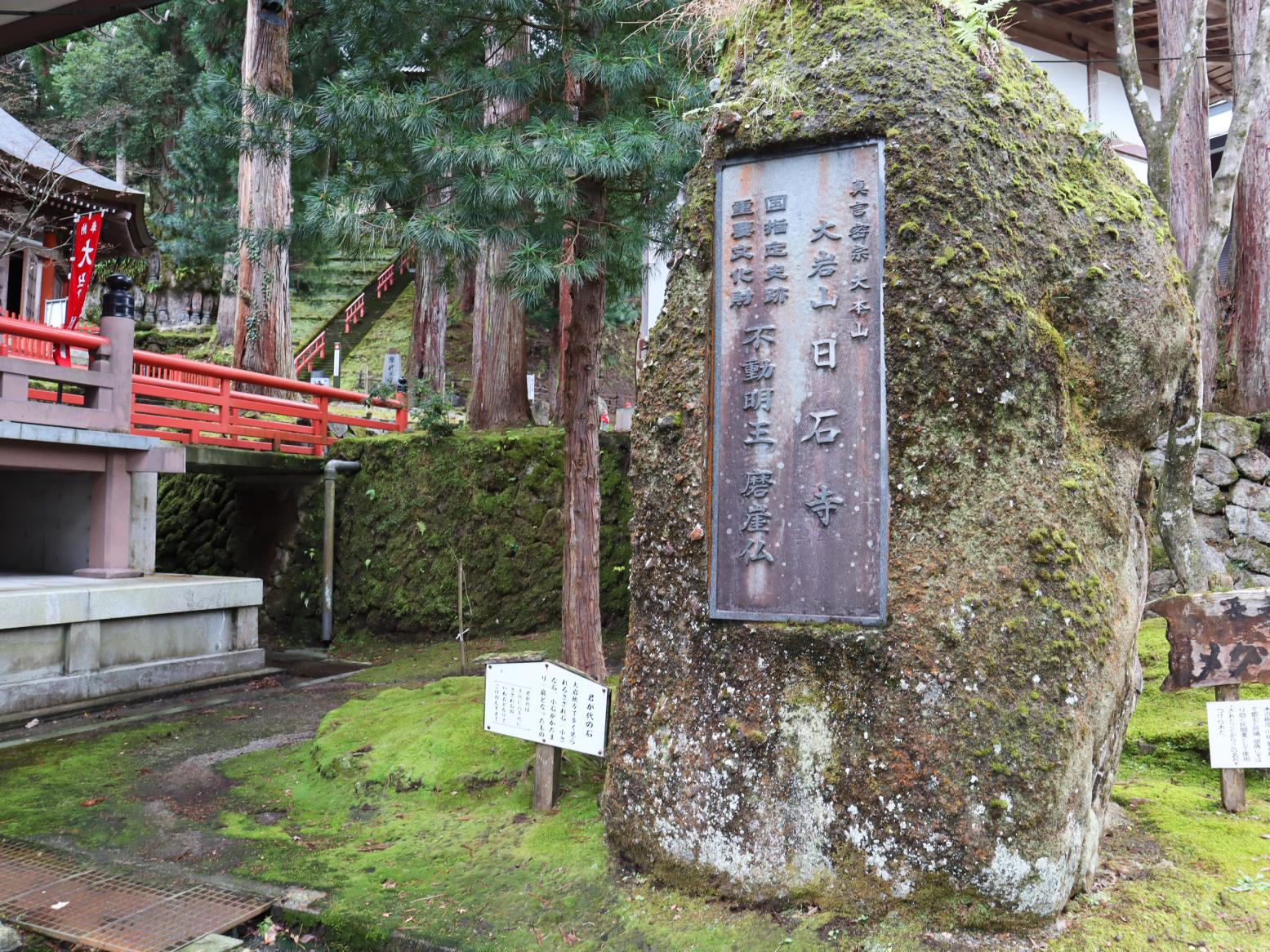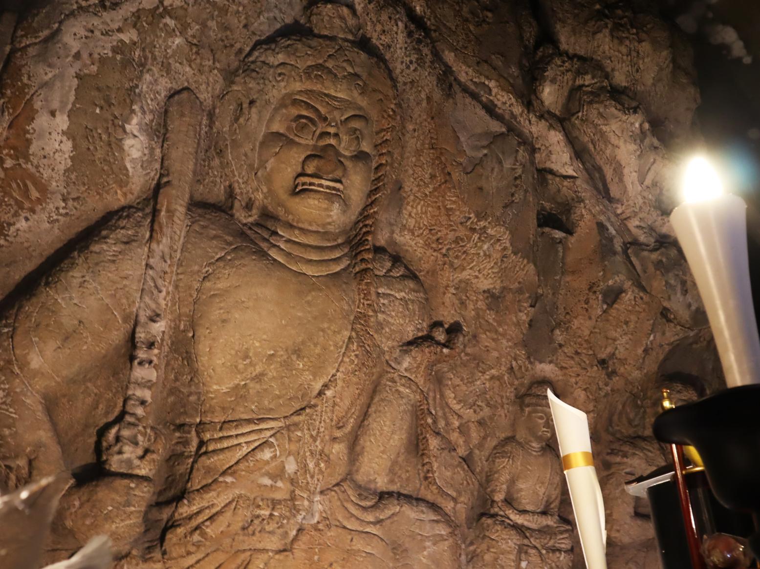 本堂の見所は、一枚岩に彫られた国の重要文化財にも指定されている3mを超す不動明王。平安時代から鎌倉時代に制作されたと言われ、迫り来る形相は圧巻の一言。不動明王像の脇には阿弥陀如来をはじめとする4体の像も一緒に彫られていて、5体が並ぶ様は息をのむ迫力です。