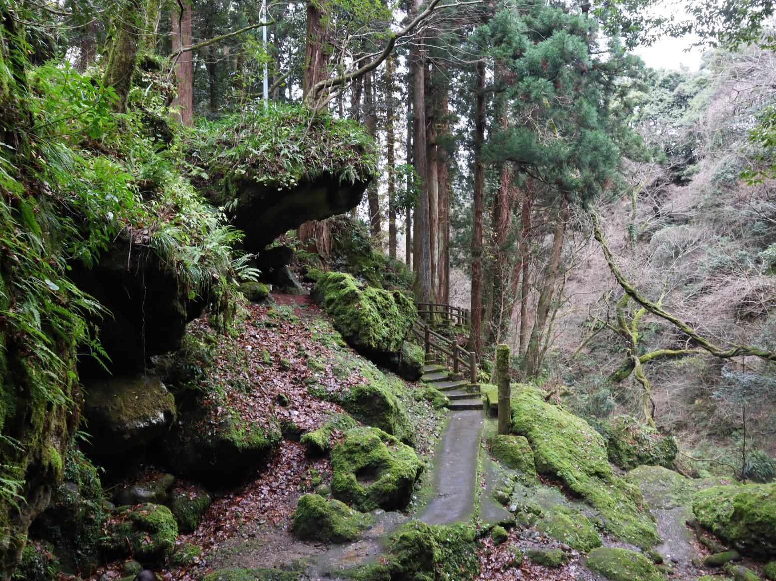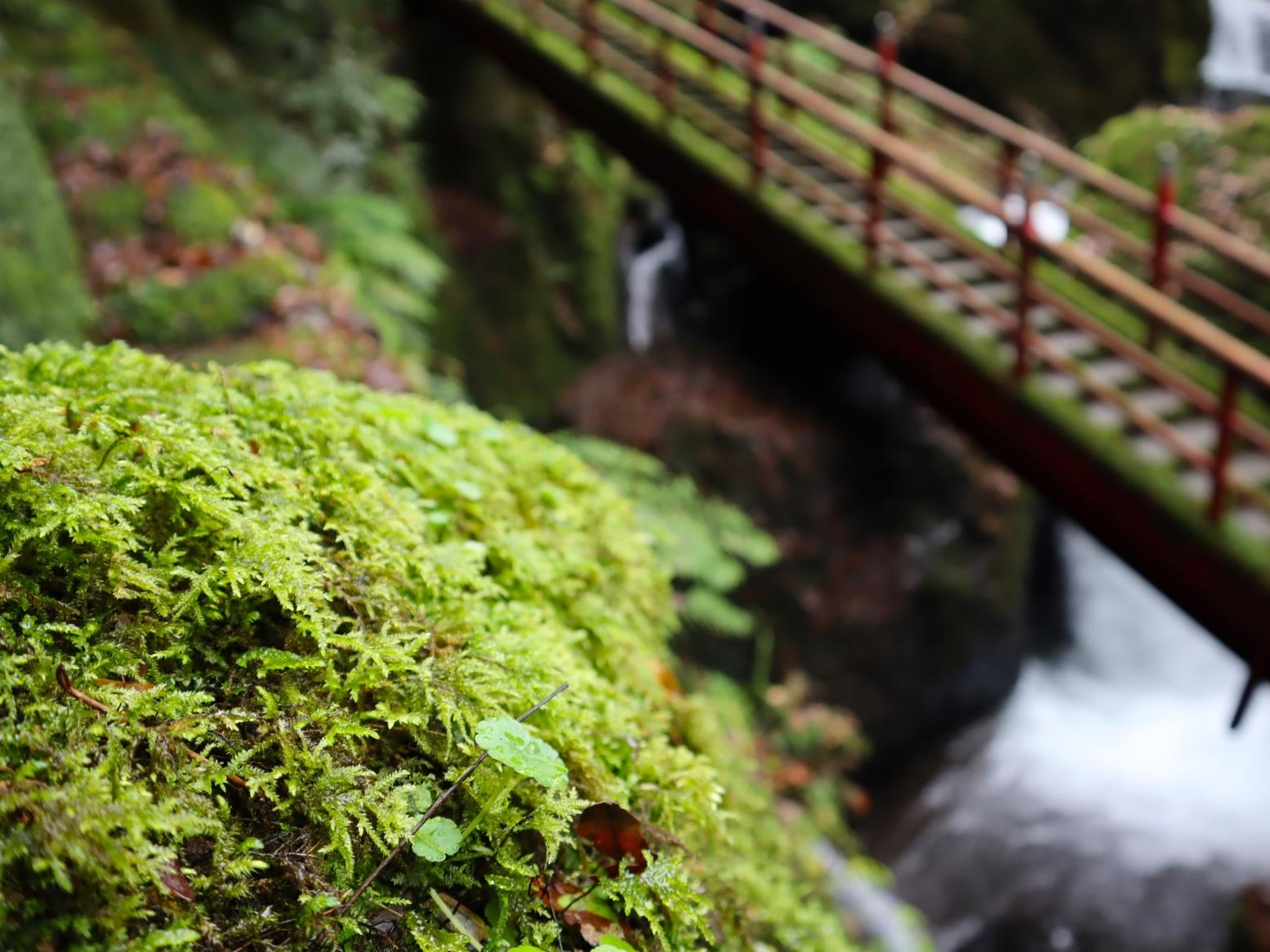 大岩山日石寺から少し歩くと、緑が美しいパワースポット「千巌渓」に到着。苔と岩に囲まれた渓谷で、ゴーっという滝の水音が響き渡る、秘境のような場所です。