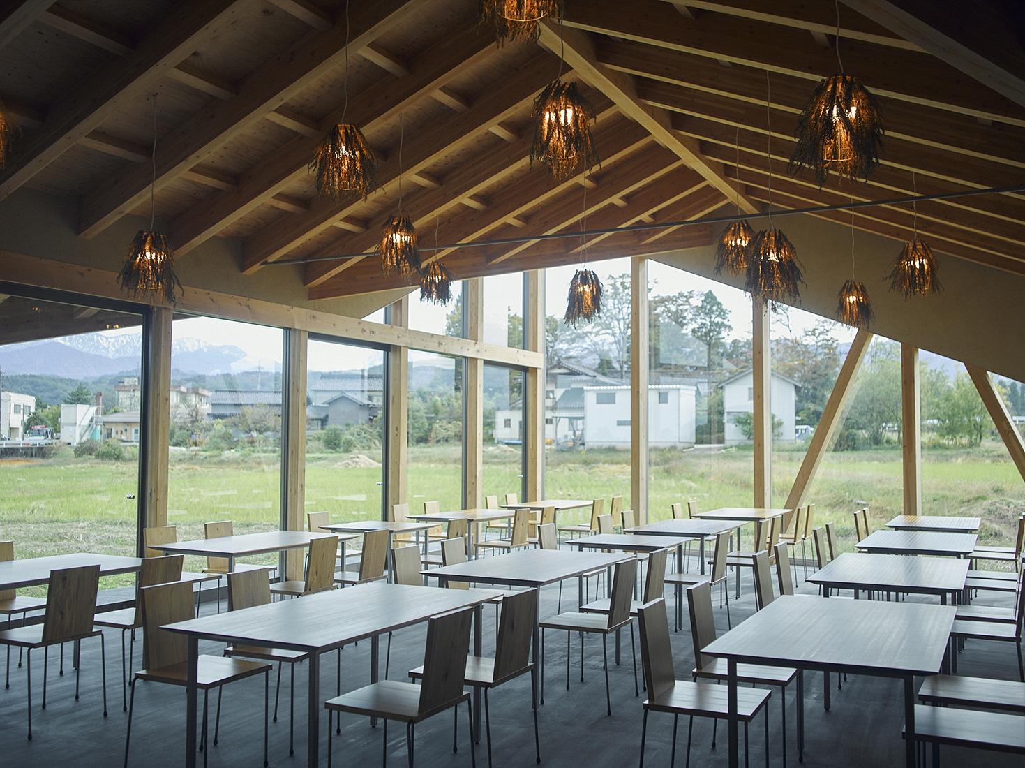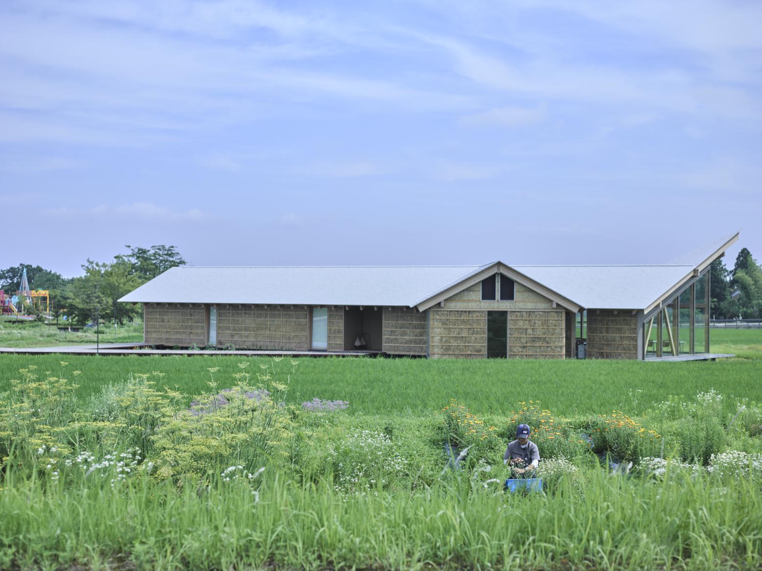 自然の中でリフレッシュしたら、「ヘルジアンウッド」へ。田園風景に自然と溶け込むように木をふんだんに使った建物は、隈研吾氏が設計。レストラン棟とアロマ工房、スパ、イベントスペースから成り立ち、施設の周囲は水田とハーブ園に囲まれています。