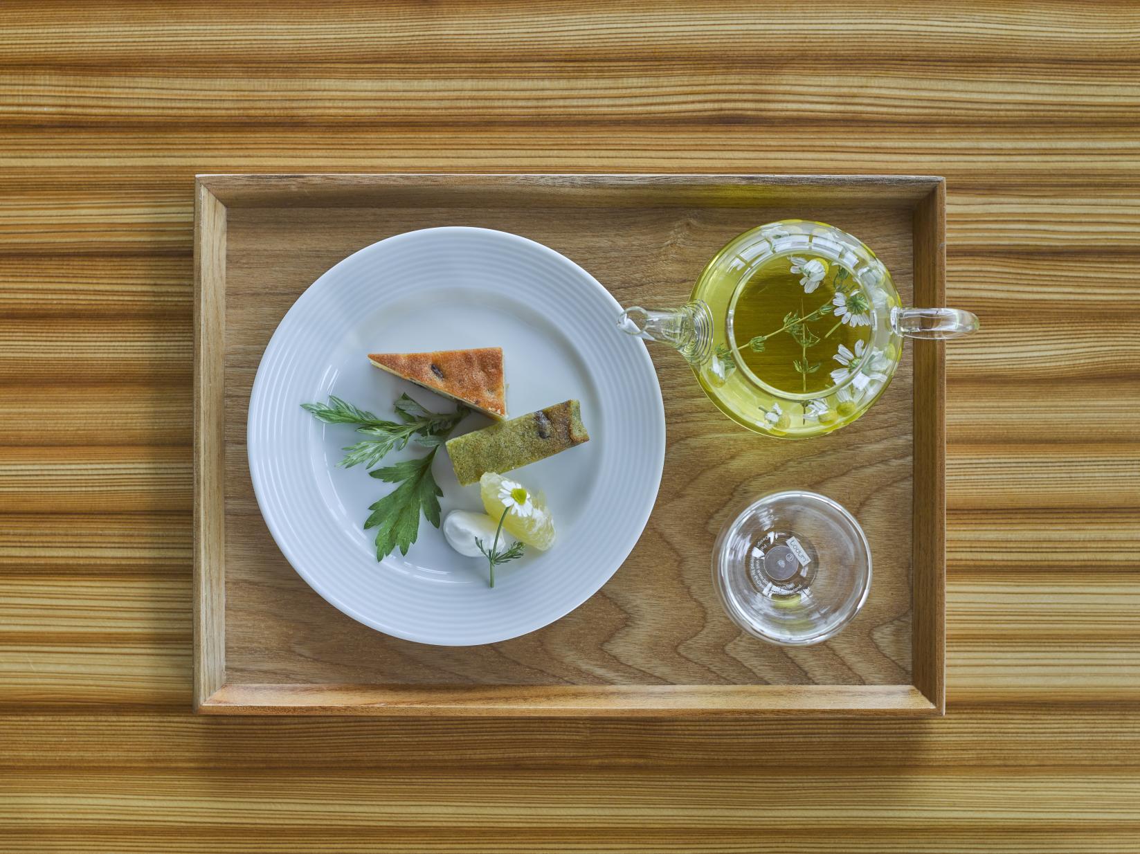 レストラン内の照明や個室の壁紙には、所々にハーブがアクセントに使われており、インテリアを素敵に彩っています。食べる・飲む以外にもハーブが上手に取り入れられており、どれも参考にしたい設え。使用されているのは、同施設の農業法人が持つハーブ園で育てられたもの。木の温もりと大きな窓からたっぷり入る光を感じる心地の良い空間で、食事の前からすでに満たされた気持ちでした。