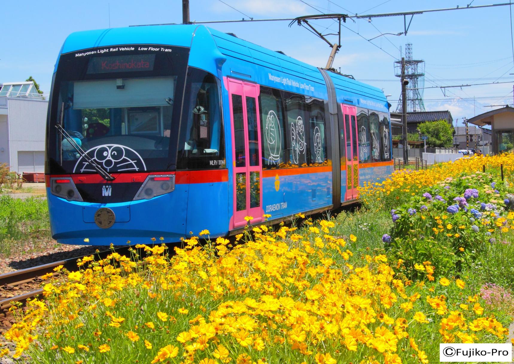 ドラえもんの作者 藤子・F・不二雄氏が高岡市で少年時代を過ごしたことから、万葉線には「ドラえもんトラム」があります。青い車体に赤いラインと黄色の鈴、入口はどこでもドアがデザインされ、窓にはお馴染みの顔ぶれが並んでいます。