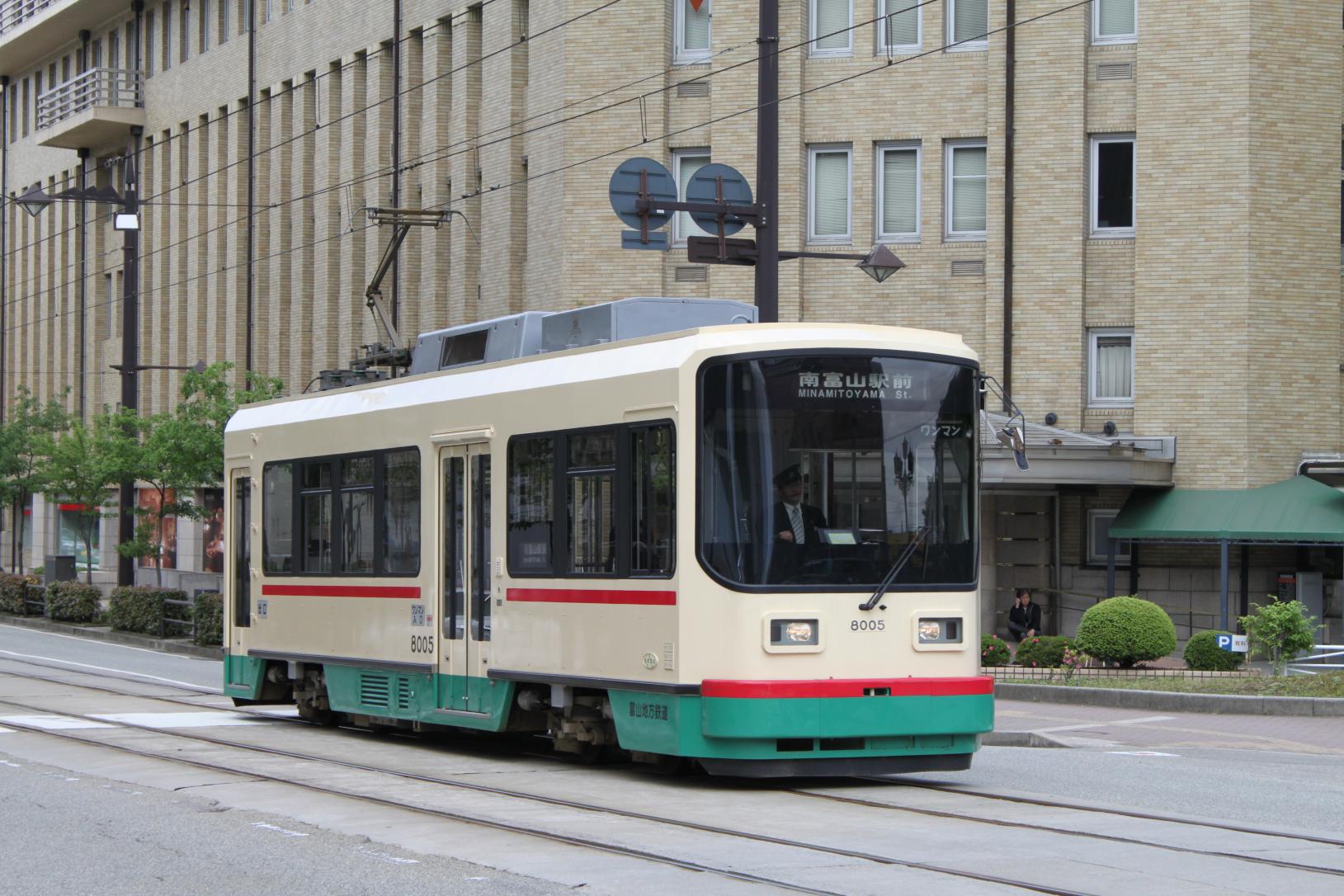富山市内を走るちょっと懐かしい路面電車です。1965 年製・7000 形車両をリニューアルしました。グリーンとベージュの配色とメタリック塗装がノスタルジック&モダンな雰囲気です。