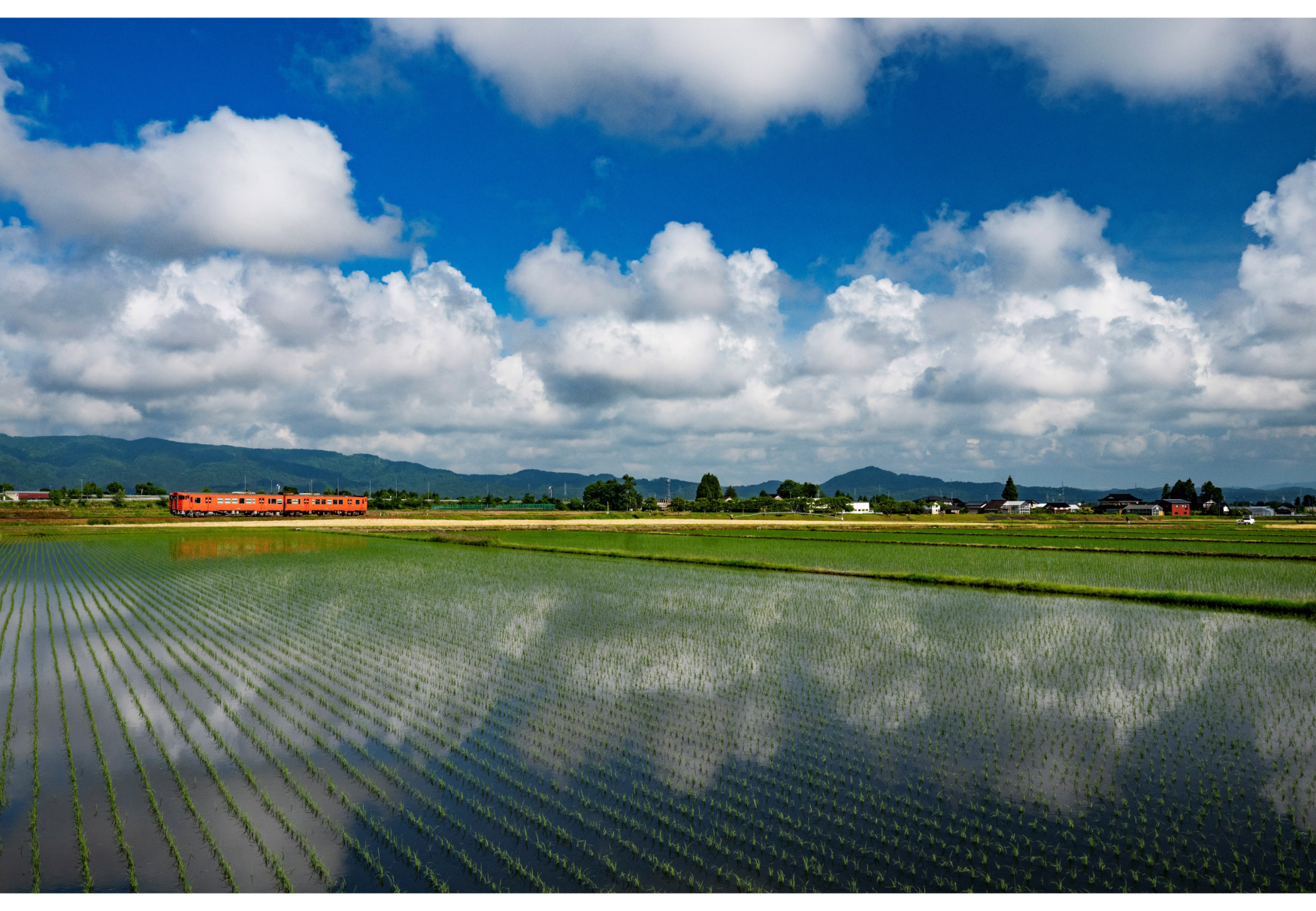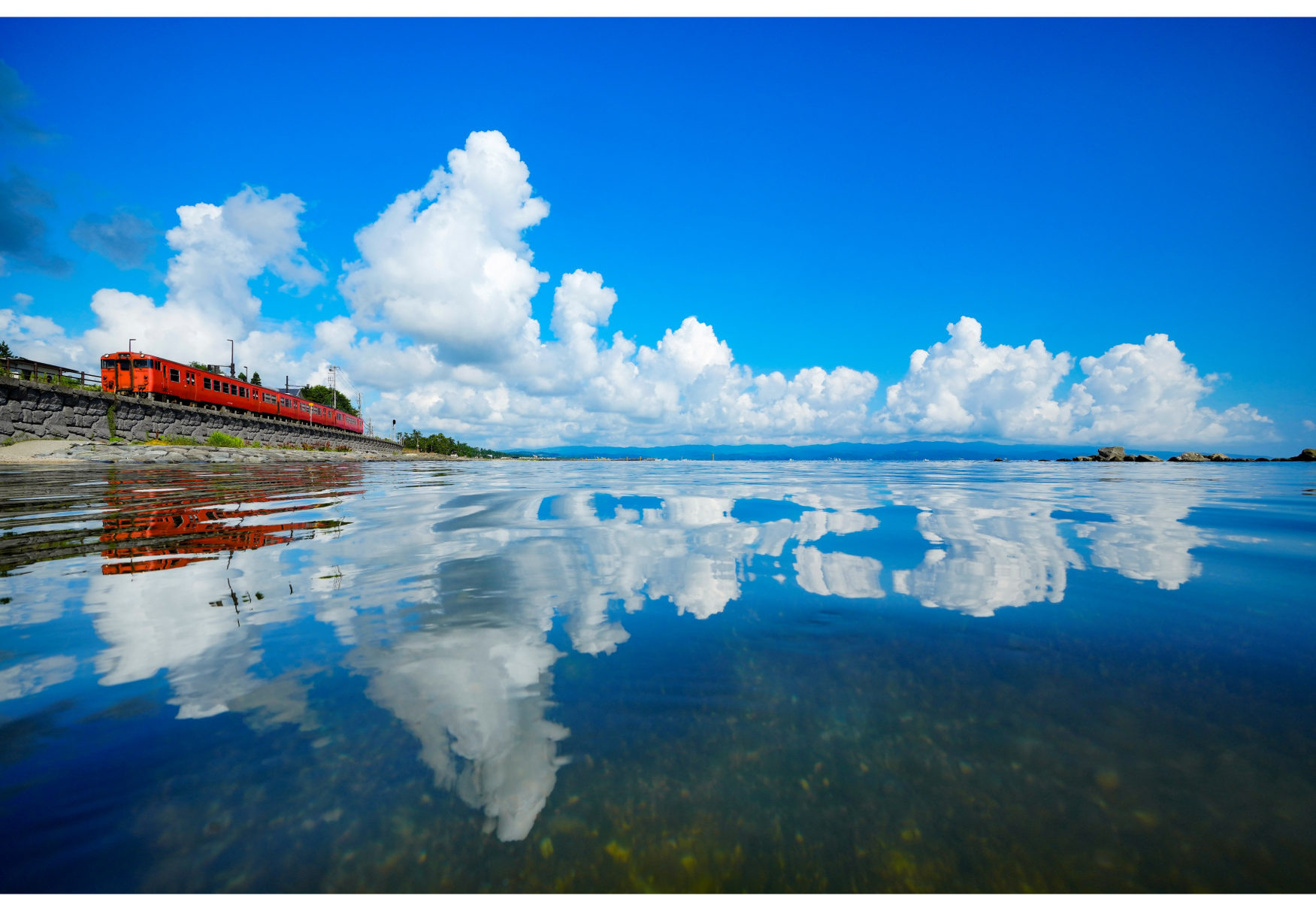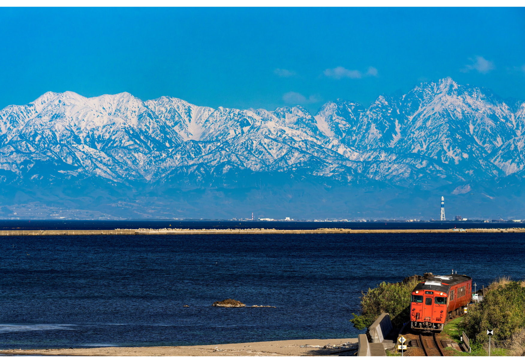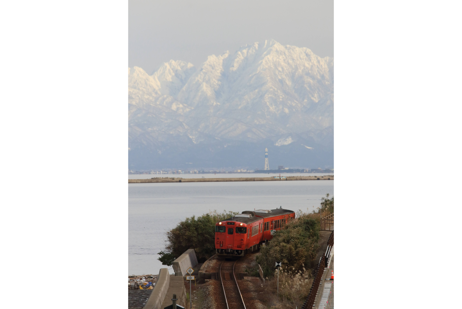 青い海の向こうに広がるのは、能登半島。懐かしい国鉄色の気動車と、息を飲むような夏の入道雲が、雨晴の水面に映ります。氷見線で撮影したこの作品は、まさに富山の美しい自然がくれた、僕の宝物。驚くことに、この場所から反対を向けば、雨晴海岸と雪をたたえた立山連峰と氷見線を撮影できます。