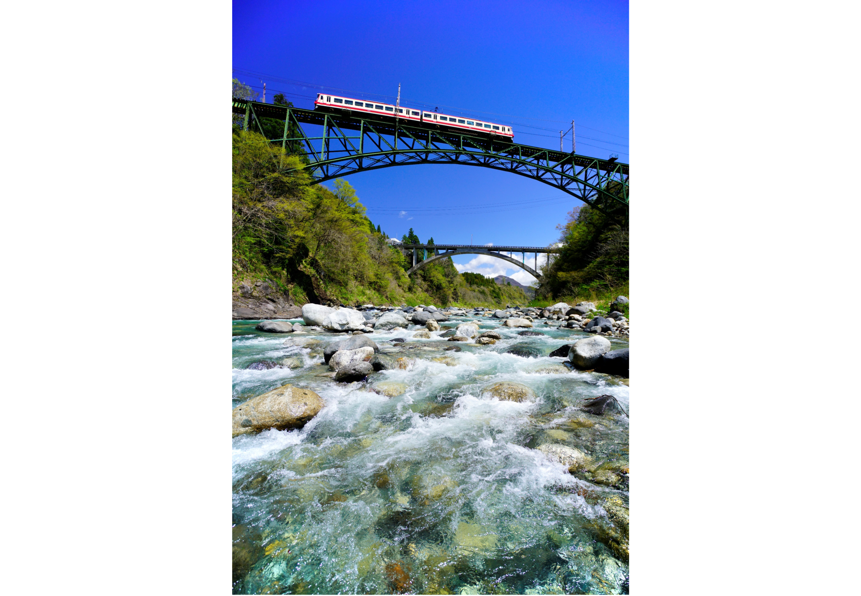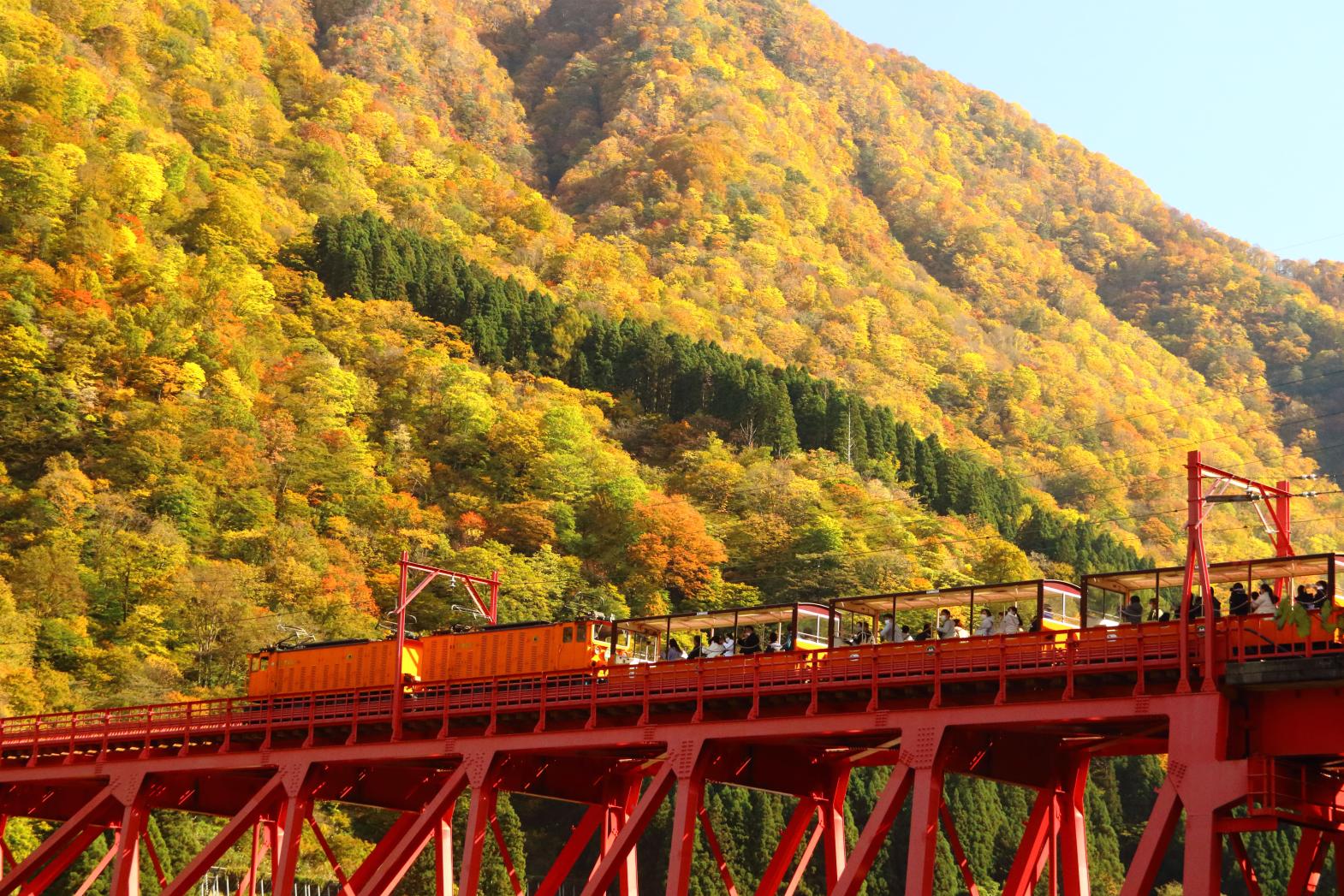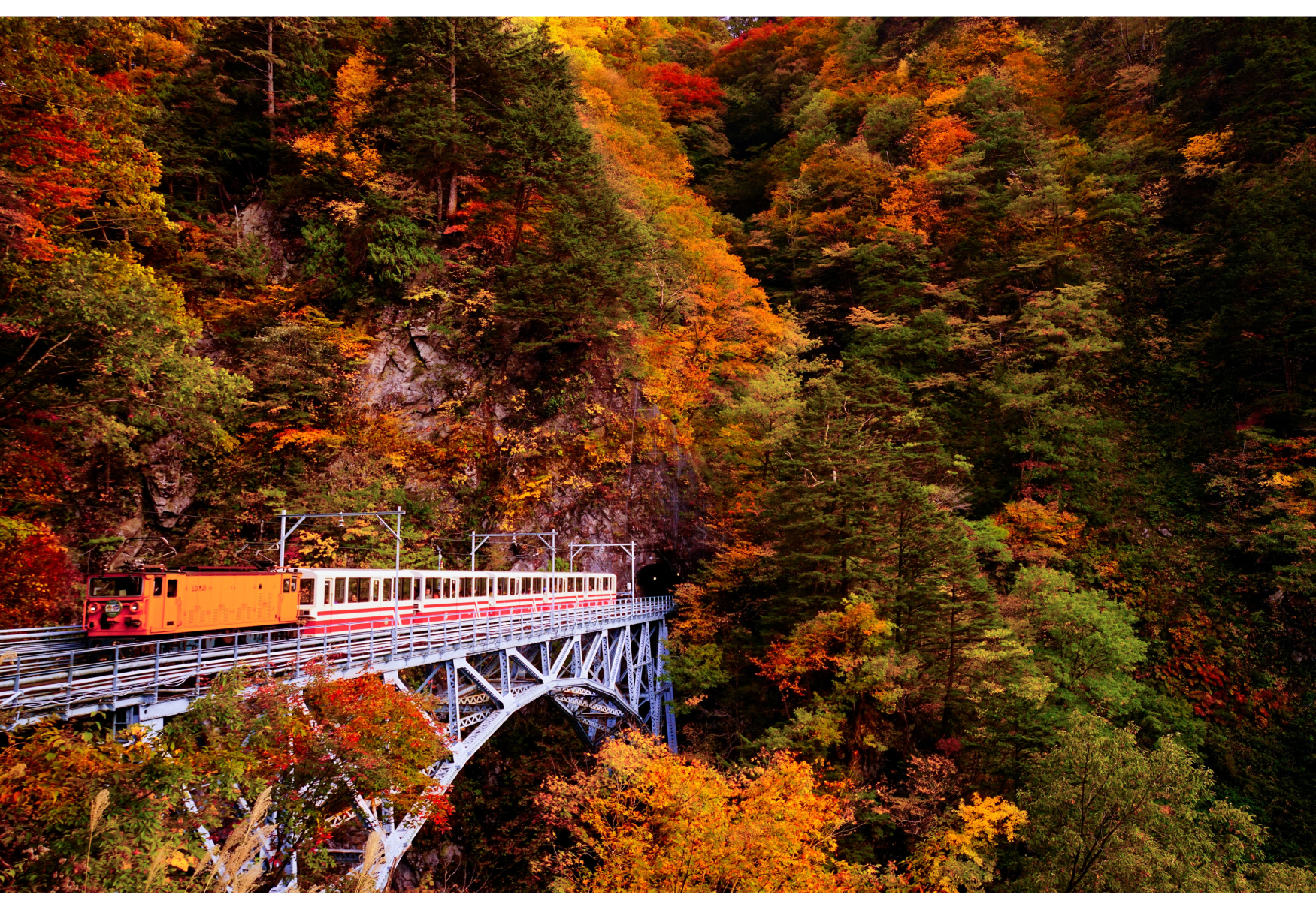 トロッコ電車の名で知られる黒部峡谷鉄道。黒部峡谷鉄道宇奈月温泉駅近くのやまびこ展望台からは、黒部峡谷にかかる赤い新山彦橋を渡ってくるトロッコと夏は深緑、秋は紅葉を撮影することができます。